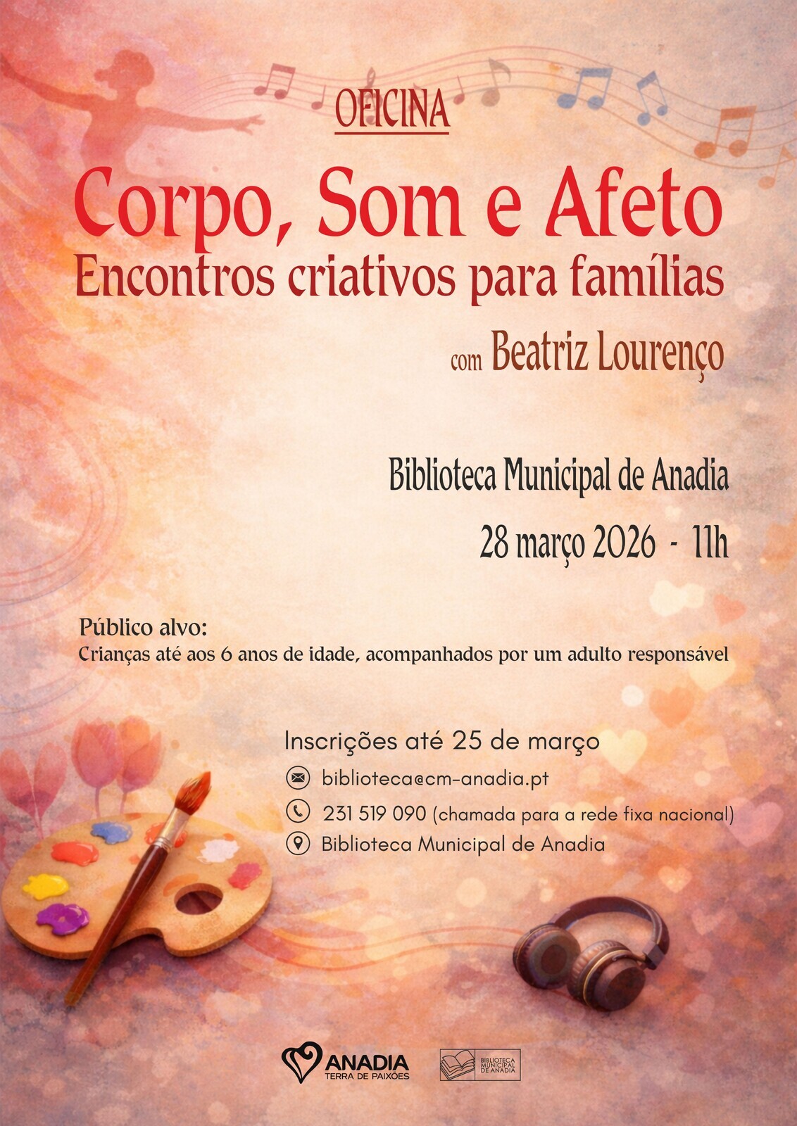 A Biblioteca Municipal de Anadia recebe no próximo dia 28 de março, pelas 11h00, a oficina “Corpo, Som e Afeto – Encontros criativos para famílias”, dinamizada por Beatriz Lourenço e dirigida a crianças até aos 6 anos de idade.