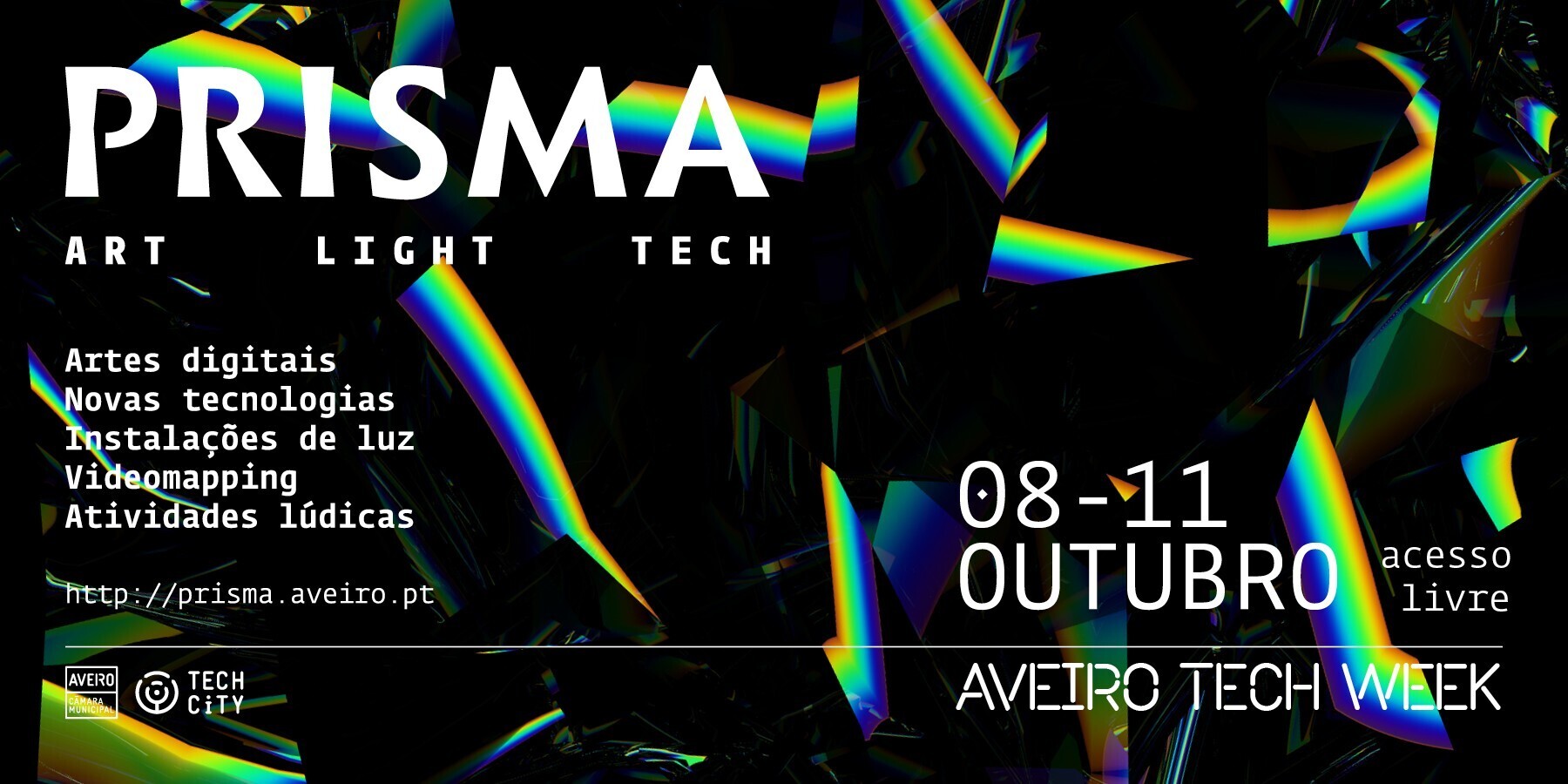 De 8 a 11 de outubro a cidade de Aveiro ganhará novas perspetivas com o festival PRISMA / Art Light Tech, evento que interliga as áreas da arte, da tecnologia e do património. O arranque do festival terá lugar no interior de vários edifícios históricos e, nos dias 10 e 11, irá estender-se para vários locais ao ar livre, com videomaping, instalações de luz em jardins, praças e ruas de Aveiro. O festival PRISMA realiza-se no âmbito da Aveiro Tech Week, uma iniciativa de acesso livre organizada pelo Teatro Aveirense / Câmara Municipal de Aveiro.