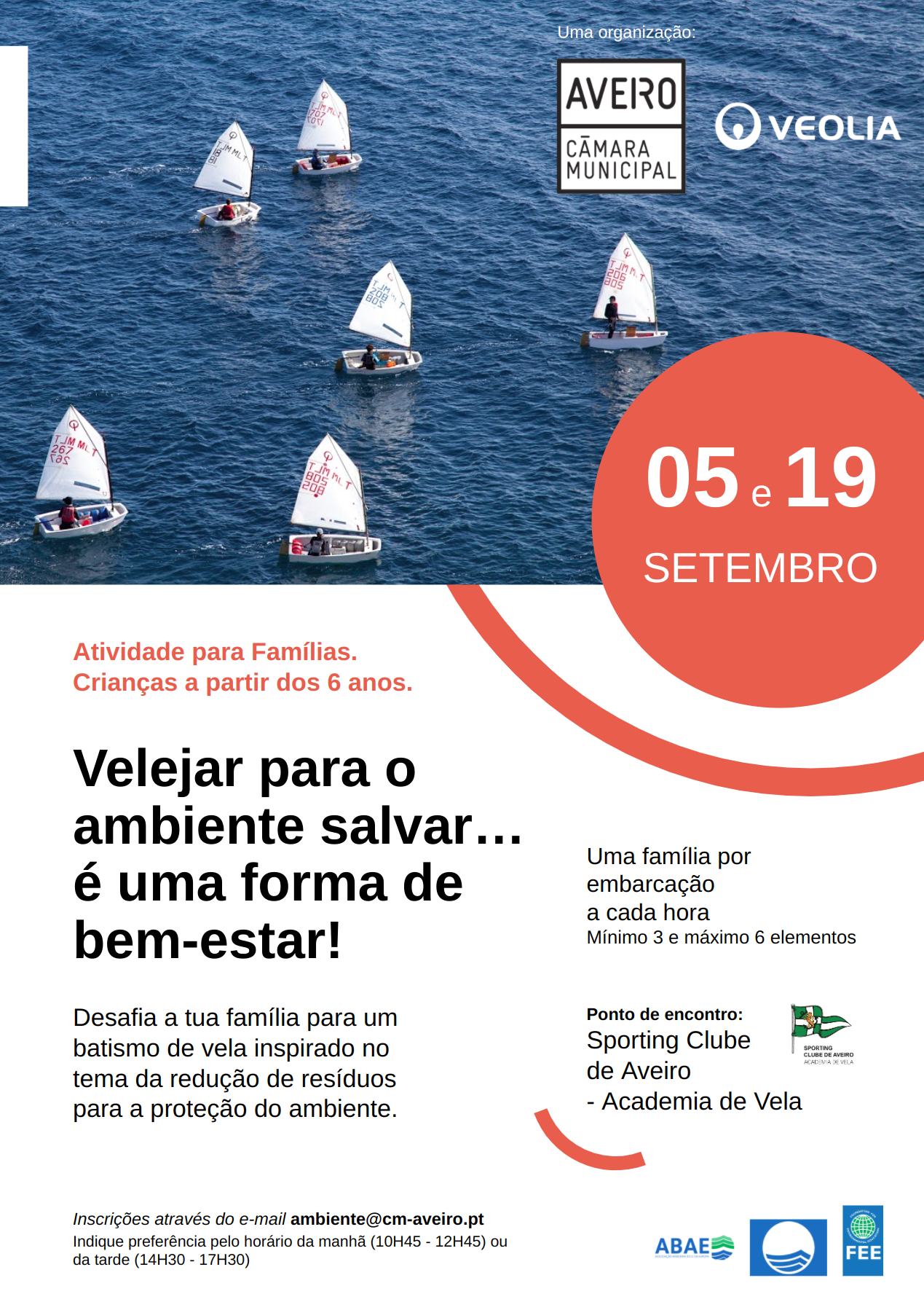 Esta atividade, dinamizada pela VEOLIA, conta com cinco sessões diárias, com a duração aproximada de 1h00, a realizar nos dias 5 e 19 de setembro (com sessões às 10h45, 11h45, 14h30, 15h30 e 16h30). Cada sessão inicia com uma breve abordagem à sensibilização ambiental para os temas da prevenção de resíduos, seguida de uma viagem numa embarcação à Vela na Ria de Aveiro.