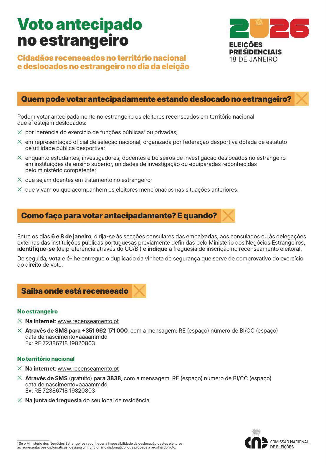 Nos dias 6, 7 e 8 de janeiro de 2026 - os eleitores recenseados em território nacional e deslocados no estrangeiro (por um dos motivos previstos na lei) votam antecipadamente nas embaixadas ou consulados previamente definidos pelo MNE