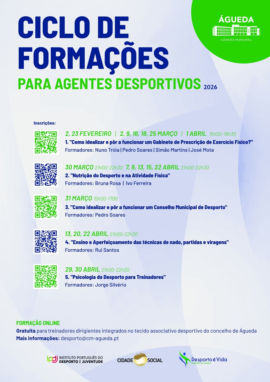 área de conteúdos (não partilhada)A Câmara Municipal de Águeda em parceria com a Cidade Social promove, nos meses de fevereiro, março e abril de 2026, o Ciclo de Formações para Agentes Desportivos, uma iniciativa estratégica que visa qualificar, valorizar e capacitar todos os intervenientes no ecossistema desportivo do concelho de Águeda.