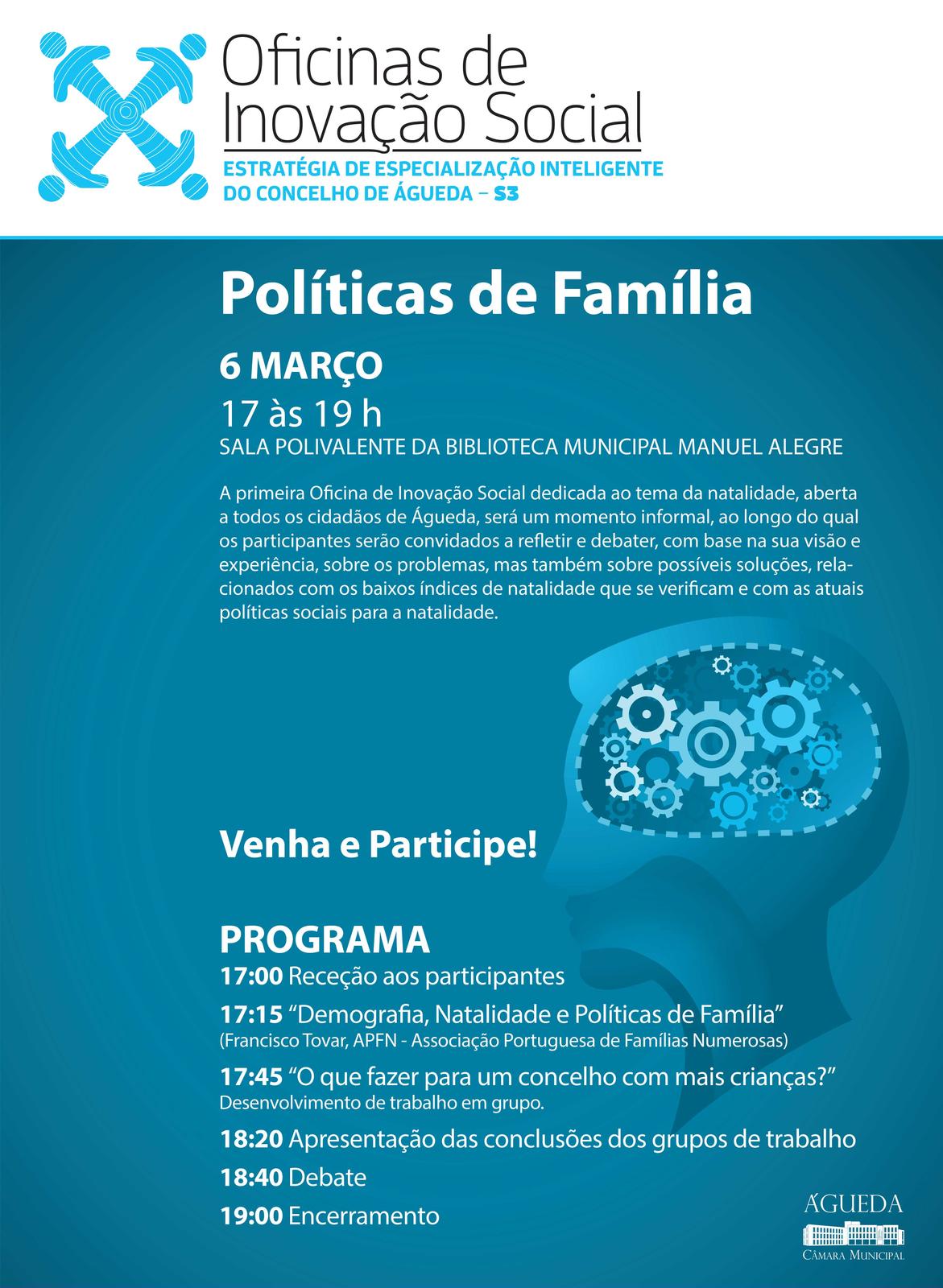 área de conteúdos (não partilhada)Realiza-se no próximo dia 6 de março, entre as 17:00 e as 19:00 horas, na Biblioteca Municipal Manuel Alegre, a 1.ª Oficina de Inovação Social dedicada ao tema da natalidade e intitulada “Políticas de Família”.