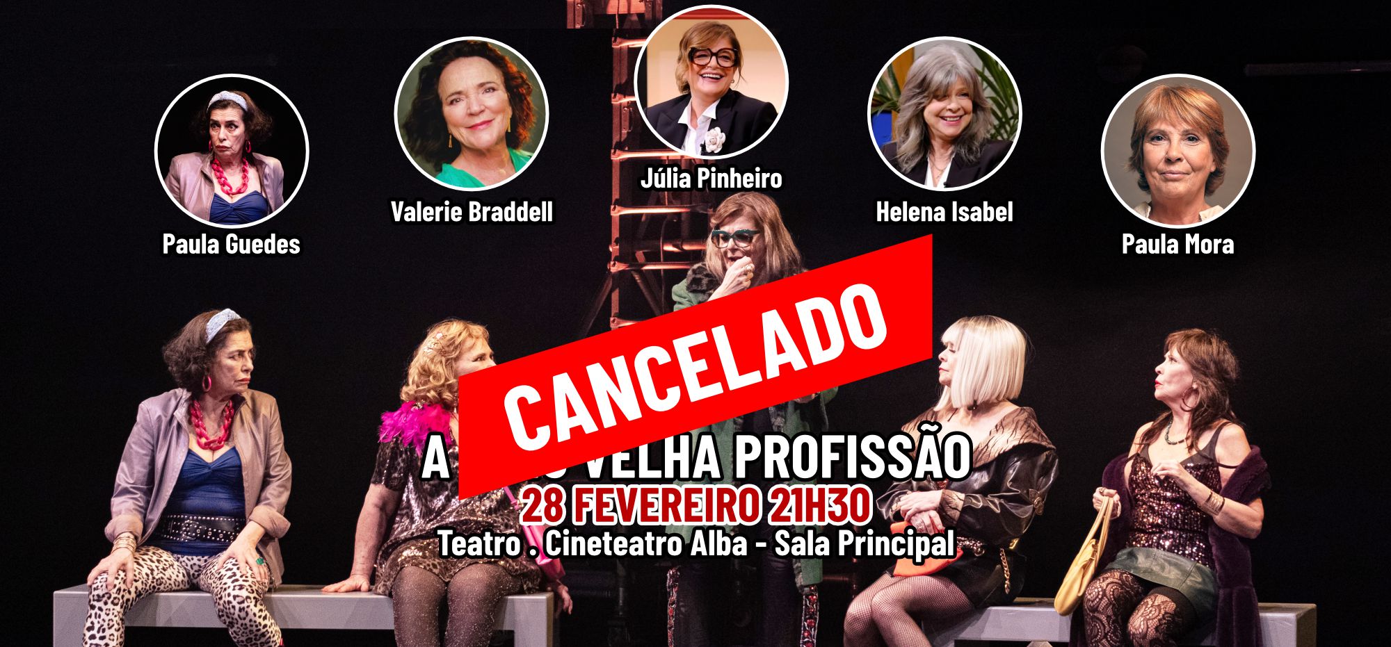 Por motivos imponderáveis e completamente alheios ao Cineteatro Alba e ao Município de Albergaria-a-Velha, informamos que o espetáculo “ A Mais Velha Profissão” com Helena Isabel, Júlia Pinheiro, Paula Guedes, Paula Mora, Valerie Braddell e Tiago Aldeia, previsto para dia 28 de fevereiro de 2026, foi cancelado.