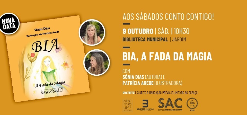 A autora Albergariense Sónia Dias, acompanhada pela ilustradora Patrícia Arede, vai apresentar o mais recente livro infantil “Bia, a Fada da Magia” numa sessão especial “Aos Sábados, Conto Contigo!”. A fada Bia vive num Planeta Encantado, onde tudo é magia. Um dia recebe uma mensagem do Rei Universo - o Planeta Terra e os seus habitantes foram invadidos por "Kroon" uma energia doente. Bia é então enviada ao Planeta Terra, onde se alia a duas crianças de coração puro para salvar o Planeta Terra e os seus habitantes.