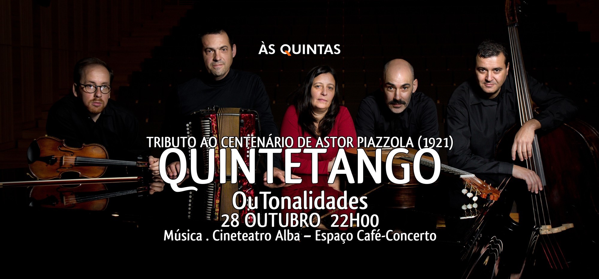 Quintetango apresenta-se em palco num Concerto-Tributo pelo Centenário do compositor argentino Astor Piazzolla, recriando a sua formação mais consagrada: Quinteto Tango Nuevo. Em Buenos Aires, nos anos 60, Astor Piazzolla formou o Quinteto Tango Nuevo, que haveria de tornar-se o veículo primeiro para a sua visão vanguardista. Durante esta década, o músico refinou o experimentalismo, esticando a estrutura formal do tango até aos seus limites.