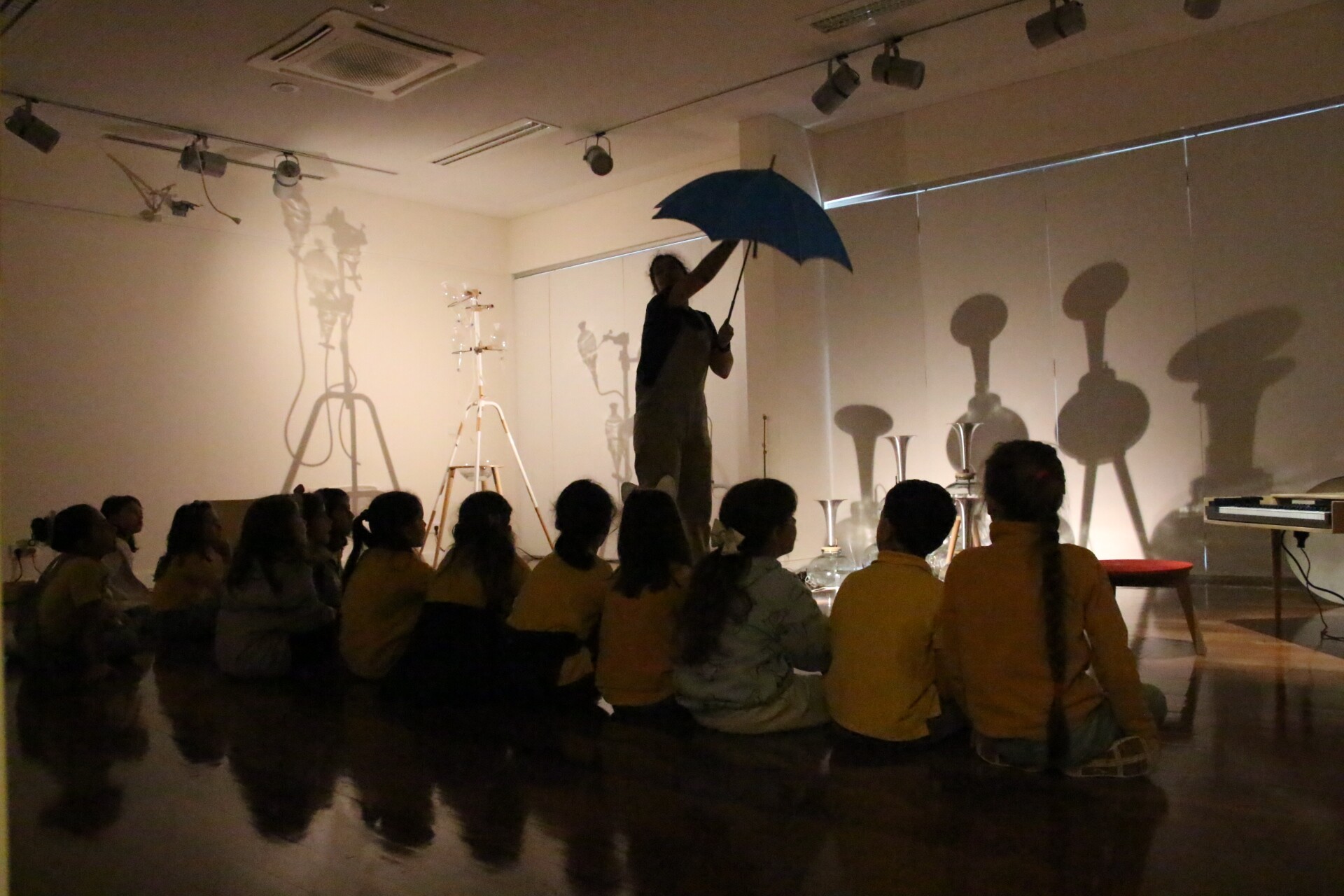As 13 sessões para grupos escolares do 1.º Ciclo decorreram na Sala de Exposições do Cineteatro Alba, sob a orientação da artista residente Mariana Miguel. O “palco” desenvolveu-se por entre a instalação “Acquarumori”, constituída por objetos cénicos que integram a peça “Aguário”, o ponto de partida para as Oficinas da Água.