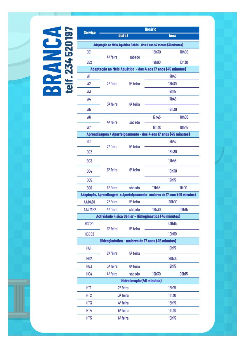 Na Piscina Municipal da Branca, a comunidade pode contar com uma oferta diversificada de horários e atividades para todas as faixas etárias, com diferentes turmas - adaptação ao meio aquático para bebés (6 aos 47 meses); adaptação ao meio aquático para crianças, jovens e adultos; aprendizagem e aperfeiçoamento das técnicas de nado para crianças, jovens e adultos; hidroginástica e hidroginástica sénior; e hidroterapia.