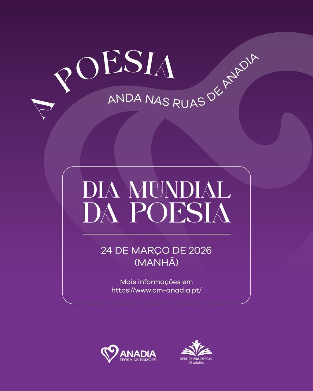 A Rede de Bibliotecas de Anadia e o Município de Anadia irão promover, à semelhança dos anos anteriores, a iniciativa “A Poesia Anda nas Ruas de Anadia”, este ano subordinada ao tema “Poesia visual”.
