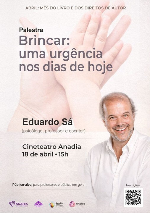O Cineteatro Anadia recebe no próximo sábado, 18 de abril, pelas 15h00, o prestigiado psicólogo, professor e escritor Eduardo de Sá que irá proferir uma palestra sobre “Brincar: uma urgência nos dias de hoje”, numa organização do Município de Anadia.