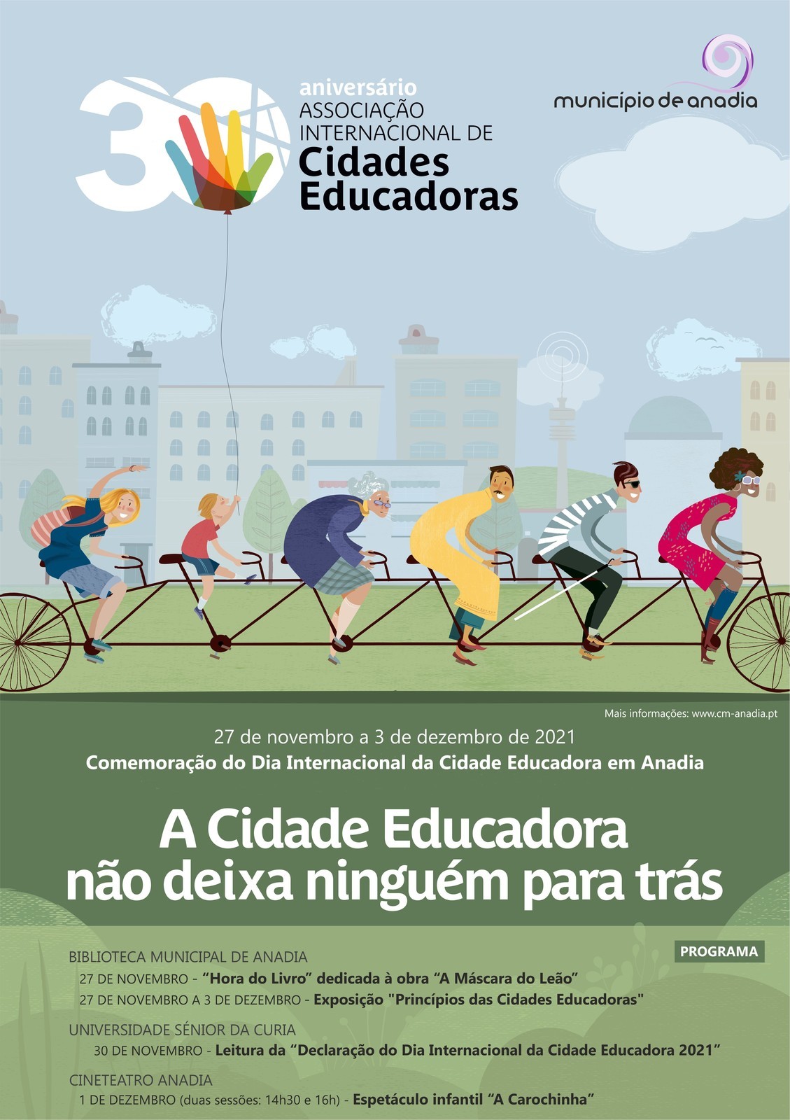 O Dia Internacional da Cidade Educadora é uma celebração de alcance mundial que destaca a importância da educação e que dá visibilidade ao compromisso dos governos locais nesta área. “A Cidade Educadora não deixa ninguém para trás" é o lema desta edição que alerta para a importância de tornar inclusiva a recuperação, após a pandemia de Covid-19, assim como para a necessidade de reforçar a ação municipal na igualdade de oportunidades, na inclusão, no progresso social e no crescimento sustentável. A Cidade Educadora vê a educação como um vetor de bem-estar, convivência, prosperidade e coesão social. Recorde-se que Anadia aderiu ao roteiro de Cidades Educadoras em 2016, passando a fazer parte do grupo de cidades que promove a educação ao longo da vida e adota uma política educativa e social.