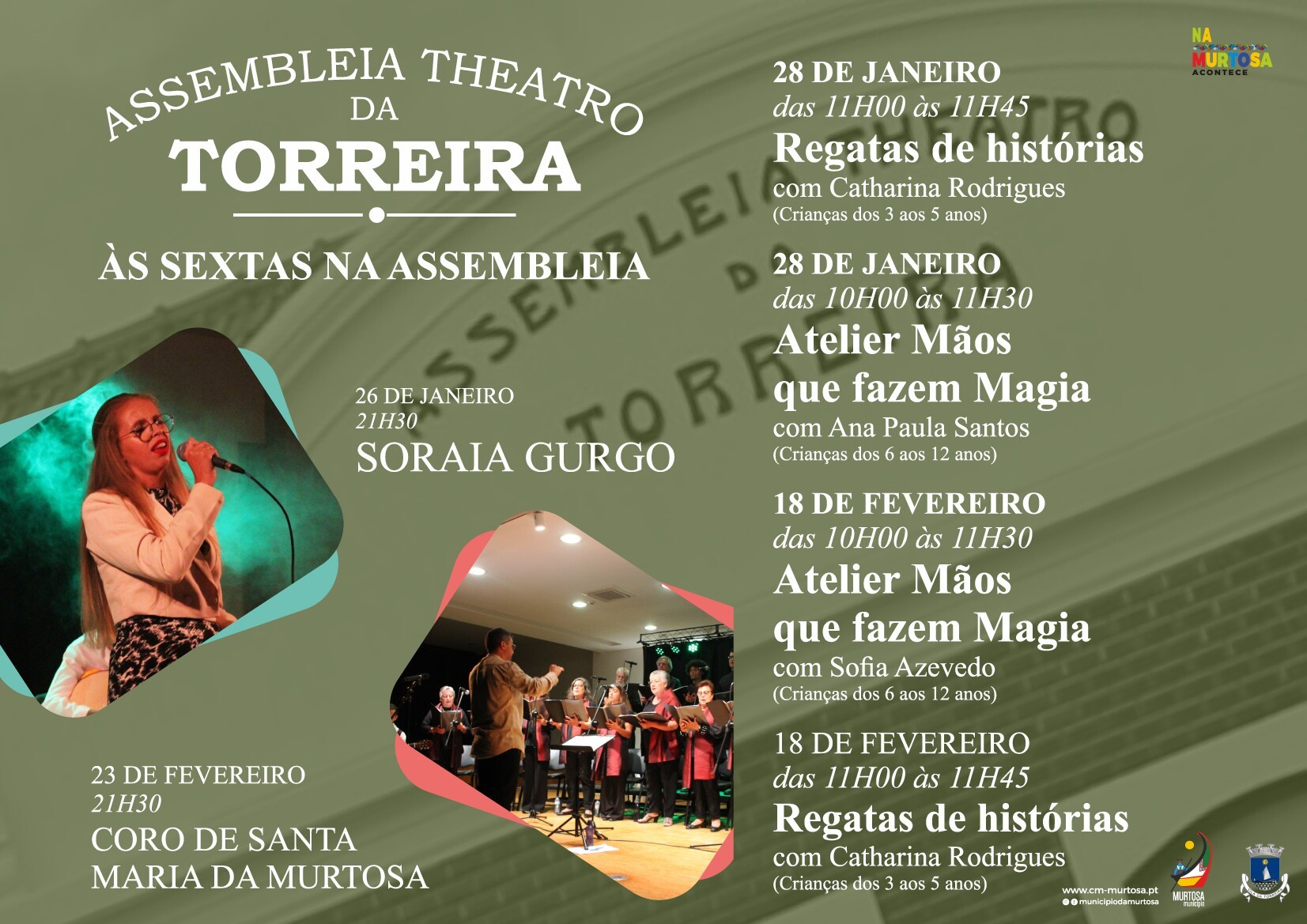 As apresentações de Soraia Gurgo (dia 26 de janeiro) e o Coro de Santa Maria da Murtosa (23 de fevereiro) iniciam a temporada 2024 do ciclo de concertos “Às Sextas na Assembleia”, organizados, em parceria, pelo Município da Murtosa e pela Junta de Freguesia da Torreira.