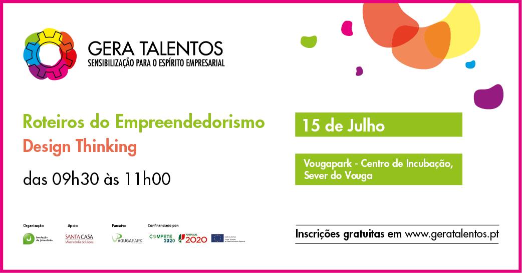 área de conteúdos (não partilhada)Numa iniciativa promovida pela Fundação da Juventude, em parceria com o VougaPark-Centro de Inovação, o Roteiro do Empreendedorismo, do Projeto Gera Talentos, vai passar por Sever do Vouga. É já no dia 15 de julho que decorre uma sessão de capacitação sob o tema “Design Thinking”, das 9h30 às 11h00. As inscrições, através de www.geratalentos.pt, são gratuitas.