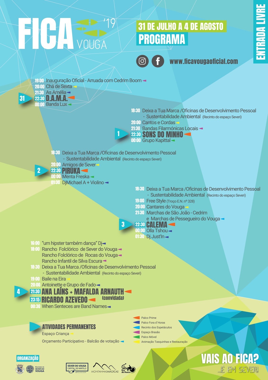 Uma arruada com os Cedrim Boom assinala a abertura da FicaVouga, pelas 19h00. Todos os dias, à hora do jantar, os grupos locais animam a área da restauração e das tasquinhas. Os talentos locais, grupos, bandas e Dj’s, sobem ao palco Fora d’Horas, antes e depois dos cabeças de cartaz que atuam diariamente às 22h30 no palco principal. A exceção é o domingo, com a música a começar pelas 16h00, no palco fora d’Horas, e às 21h30, no palco principal. O Espaço Brasão é reservado à tradição com a atuação das Bandas Filarmónicas (01/08) e dos Ranchos Folclóricos (04/08). Já as marchas de São João (03/08), das freguesias de Cedrim e Pessegueiro do Vouga, atuam no recinto dos espetáculos.