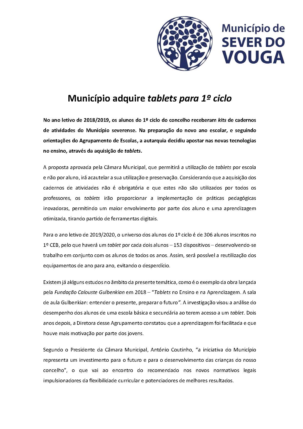 No ano letivo de 2018/2019, os alunos do 1º ciclo do concelho receberam kits de cadernos de atividades do Município severense. Na preparação do novo ano escolar, e seguindo orientações do Agrupamento de Escolas, a autarquia decidiu apostar nas novas tecnologias no ensino, através da aquisição de tablets.