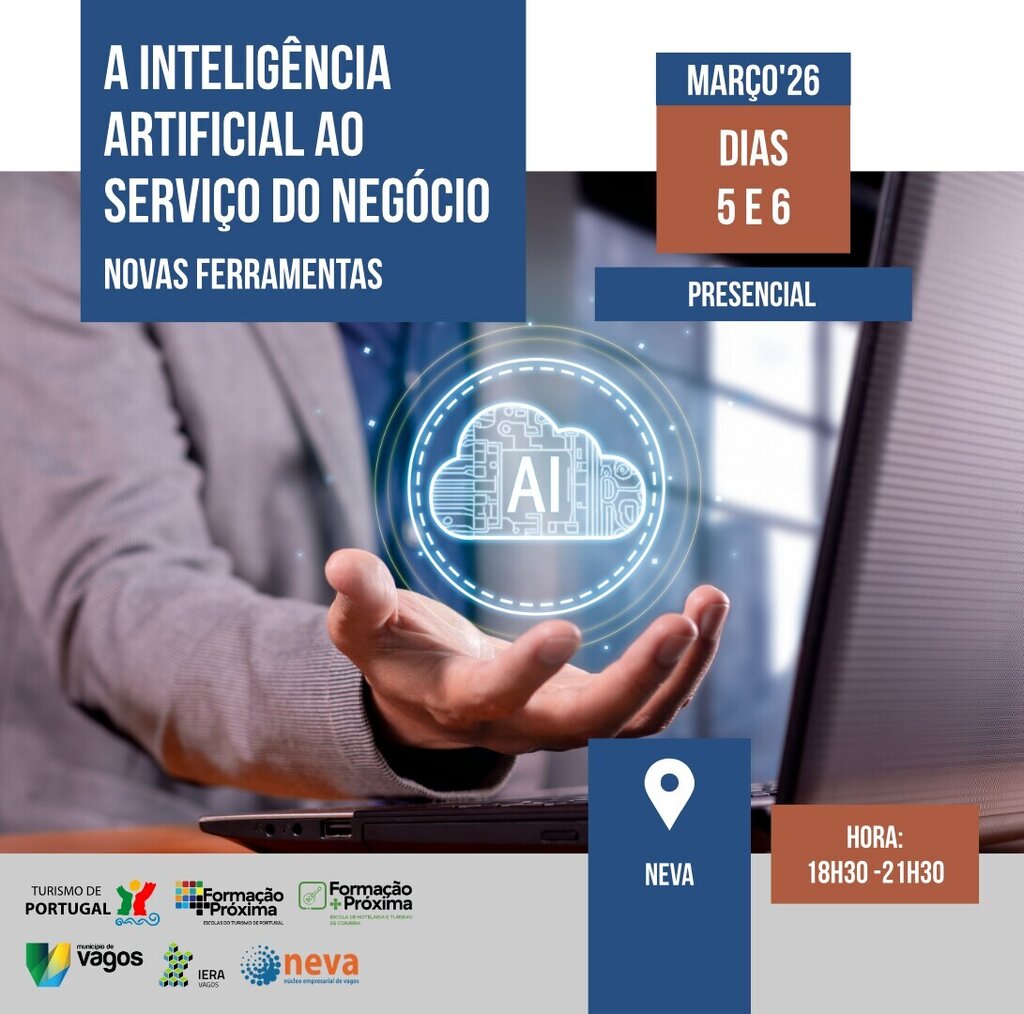 O Turismo de Portugal e o Município de Vagos promovem, nos dias 5 e 6 de março de 2026, a formação “A Inteligência Artificial ao Serviço do Negócio: novas ferramentas”, no NEVA – Núcleo Empresarial de Vagos.