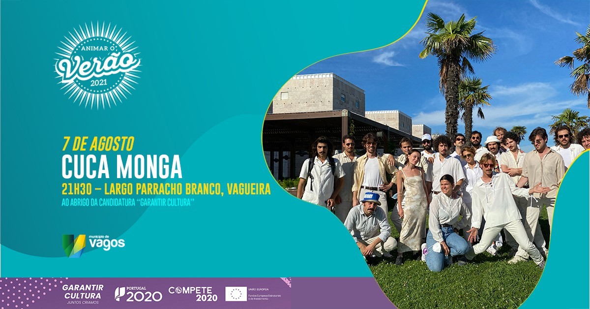 área de conteúdos (não partilhada)Realiza-se, no sábado, dia 7 de agosto de 2021, o espetáculo musical com "CUCA MONGA", às 21h30, no Largo Parracho Branco - Praia da Vagueira.