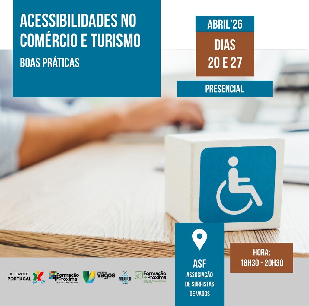 O Turismo de Portugal e o Município de Vagos promovem, nos dias 20 e 27 de abril de 2026, a formação "Acessibilidades no Comércio e Turismo: boas práticas", que terá lugar na ASF – Associação de Surfistas de Vagos.
