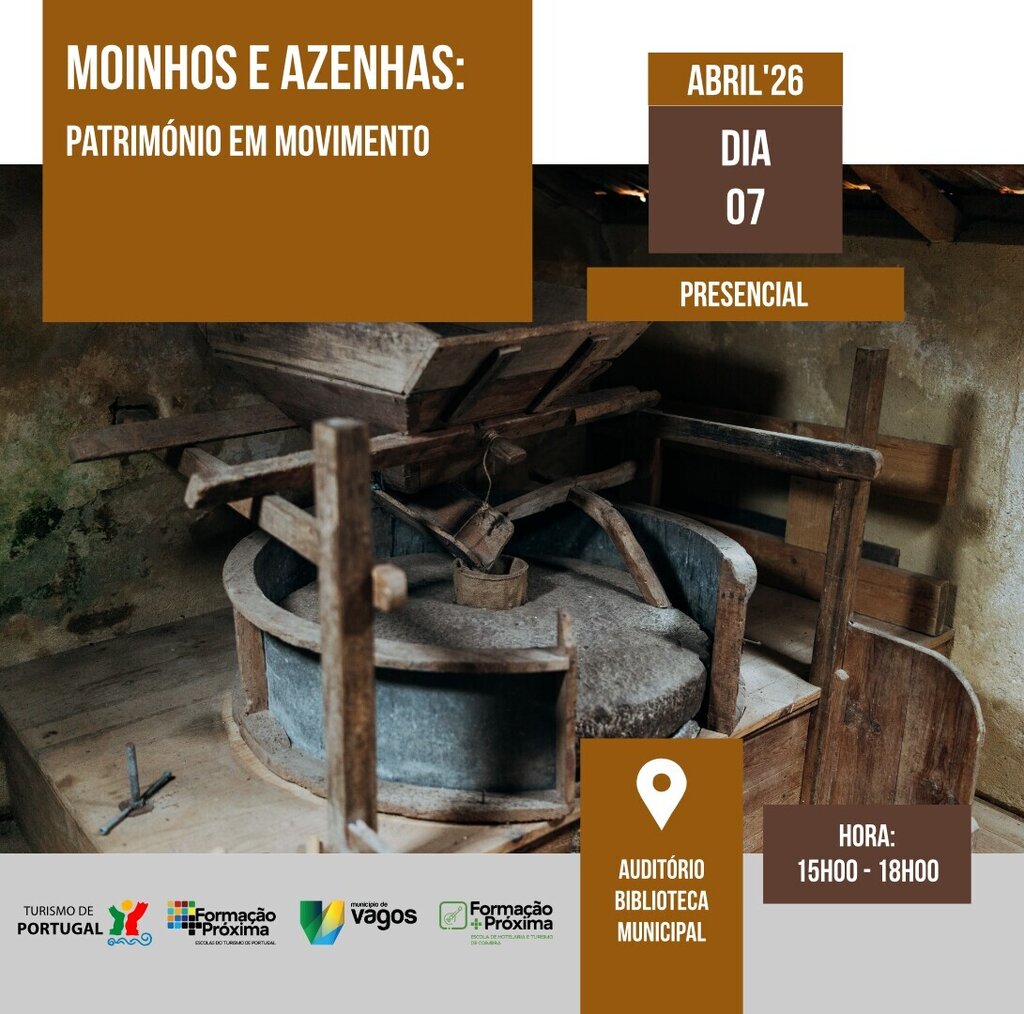 O Turismo de Portugal e o Município de Vagos promovem, no dia 7 de abril de 2026, a formação "Moinhos e Azenhas: património em movimento", que terá lugar na Biblioteca Municipal João Grave.