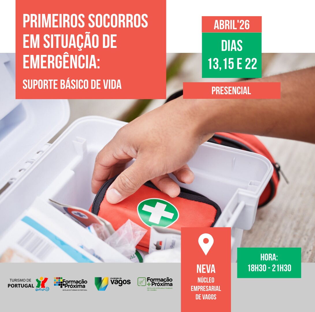 O Turismo de Portugal e o Município de Vagos promovem, nos dias 13,15 e 22 de abril de 2026, a formação "Primeiros Socorros em Situação de Emergência: suporte básico de vida", que terá lugar no NEVA – Núcleo Empresarial de Vagos.