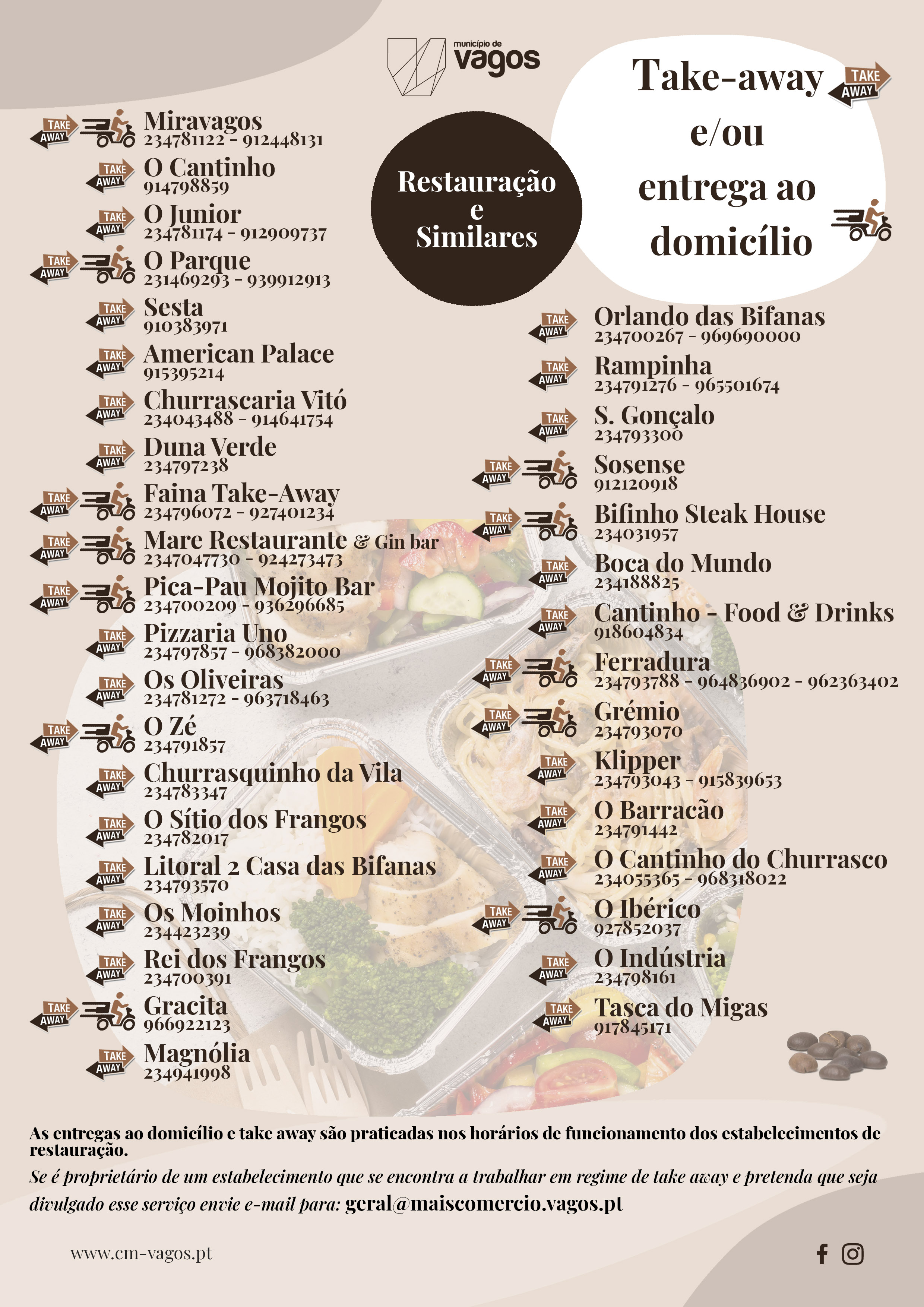 área de conteúdos (não partilhada)Atendendo às novas medidas impostas no âmbito do novo estado de emergência, a Câmara Municipal de Vagos e o Núcleo Empresarial de Vagos (NEVA) retomam a elaboração e respetiva divulgação de um diretório que reúne os estabelecimentos de restauração e similares, do concelho de Vagos, que se encontram em regime de take-away e entregas ao domicílio neste novo confinamento, como forma de apoiar os empresários deste setor de atividade.