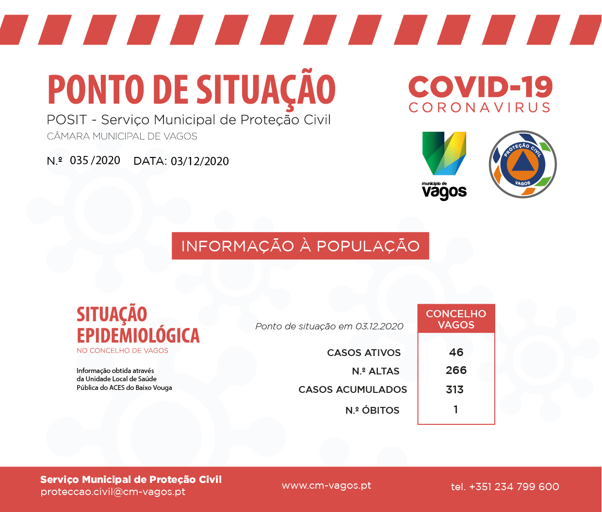 O Serviço Municipal de Proteção Civil da Câmara Municipal de Vagos emitiu, hoje, dia 03 de dezembro de 2020, um novo ponto de situação municipal no âmbito da pandemia COVID-19.