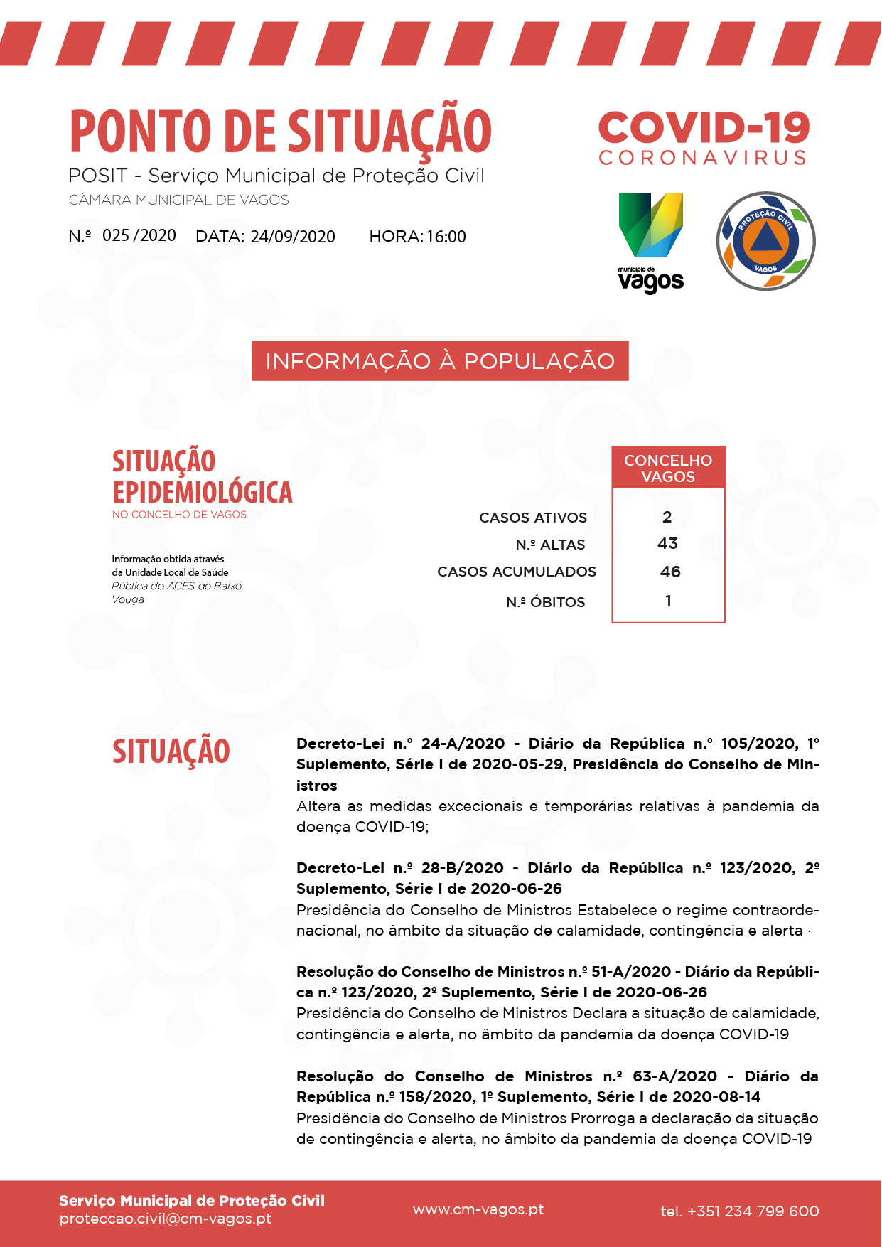 O Serviço Municipal de Proteção Civil da Câmara Municipal de Vagos emitiu, hoje, dia 24 de setembro de 2020, um novo ponto de situação municipal no âmbito da pandemia COVID-19.
