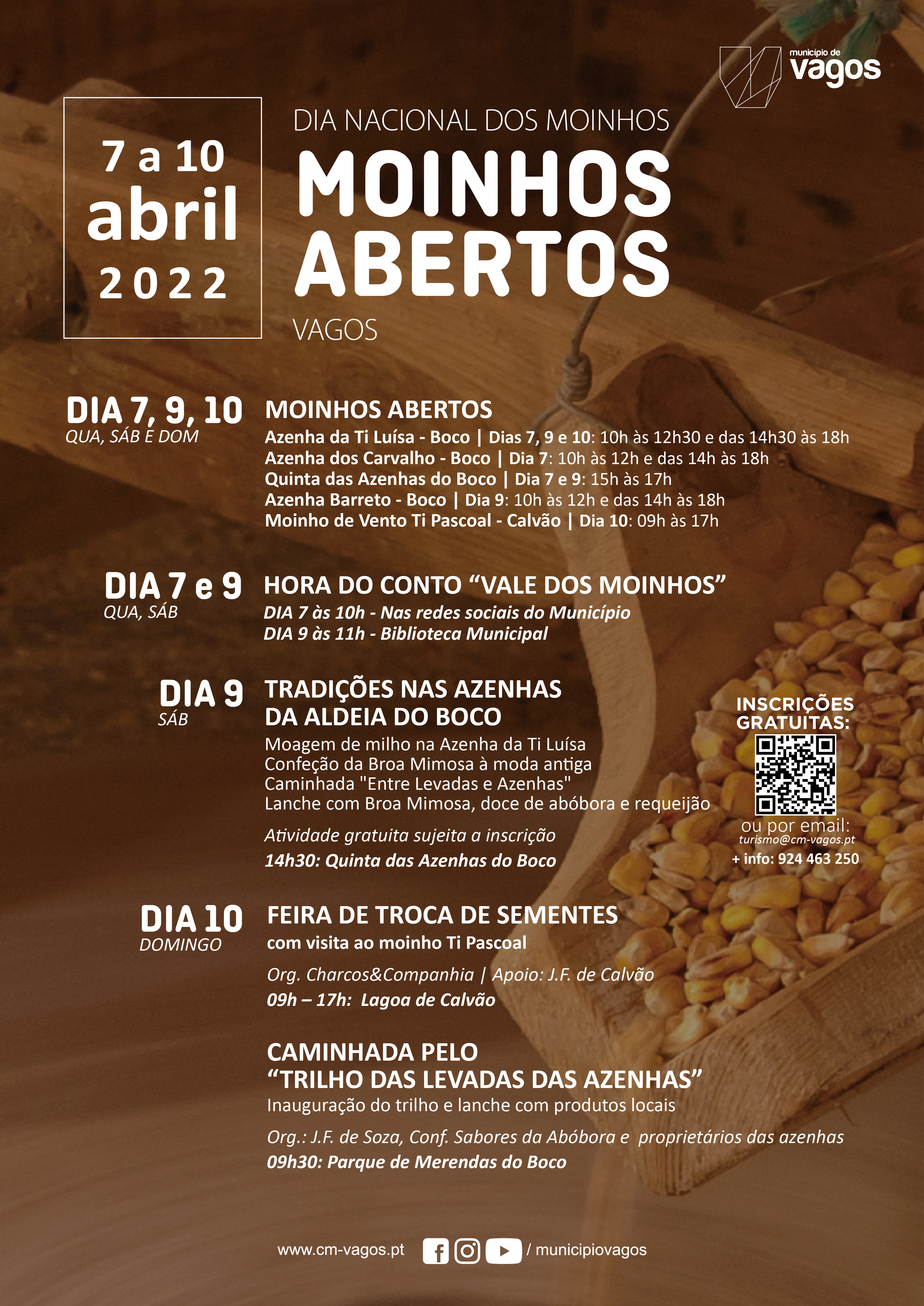 No âmbito da Comemoração do Dia Nacional dos Moinhos, que se celebra no dia 7 de abril de 2022, o Município de Vagos promove, em conjunto com a Junta de Freguesia de Soza, Confraria Sabores da Abóbora, Charcos&Companhia, Junta de Freguesia de Calvão e os proprietários dos moinhos/azenhas do concelho, nos dias 7, 9 e 10 de abril de 2022, três dias de atividades em torno do património molinológico.