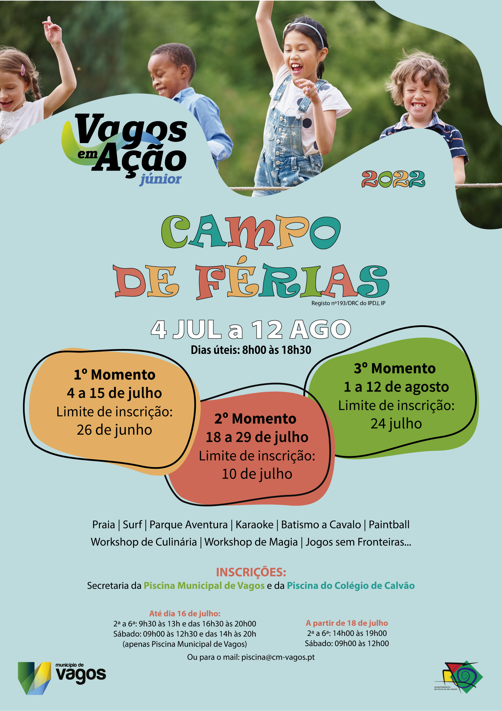 área de conteúdos (não partilhada)A Câmara Municipal de Vagos (CMV), em parceria com o Agrupamento de Escolas de Vagos, encontra-se a organizar o Programa Municipal Vagos em Ação Júnior – Verão 2022 (VEAJ).