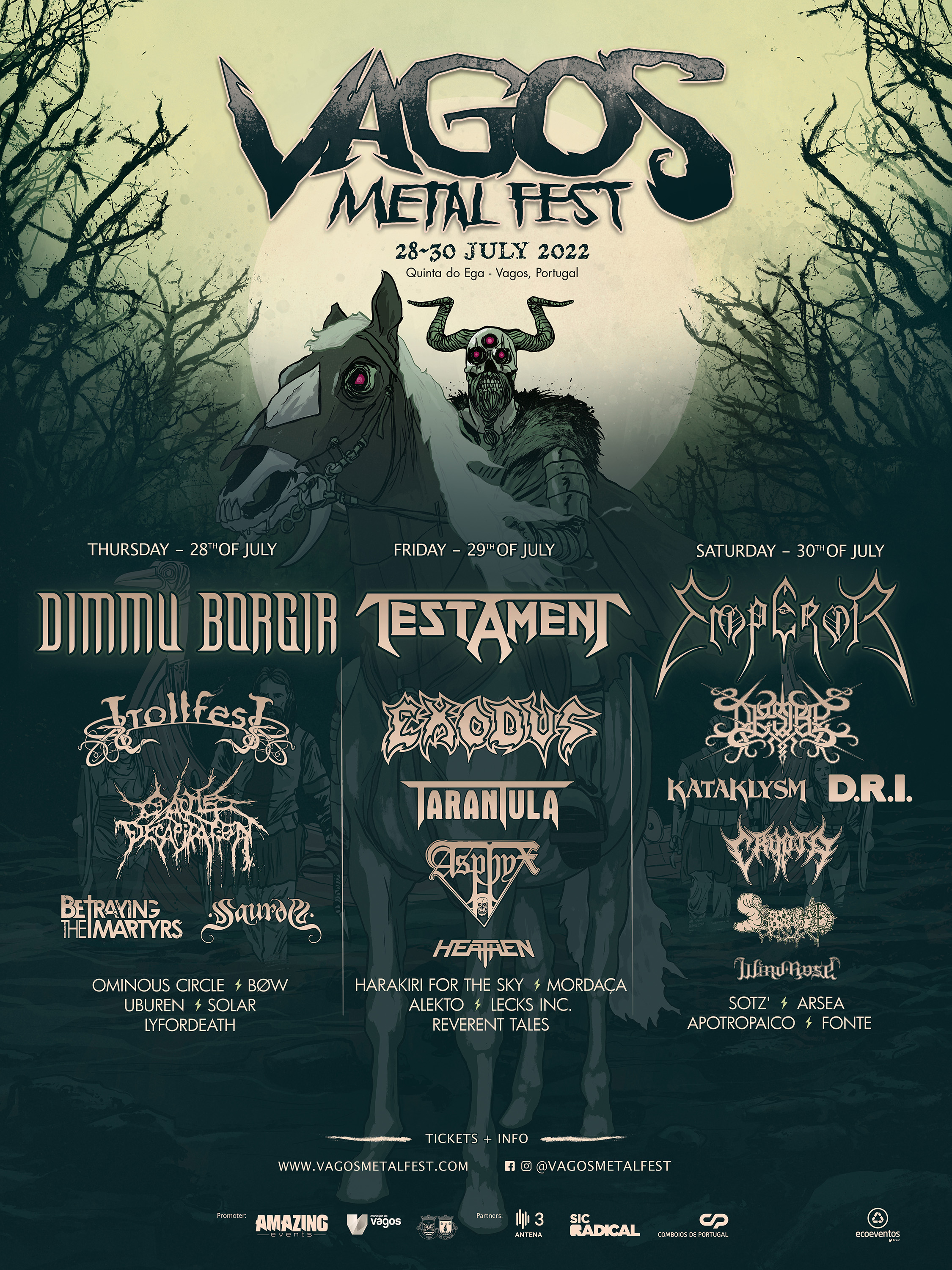 É com prazer que anunciamos os cabeças de cartaz do Vagos Metal Fest - Dimmu Borgir, Testament, Emperor, Trollfest, Exodus que mostraram vontade de atuar para o melhor público do mundo: vocês!