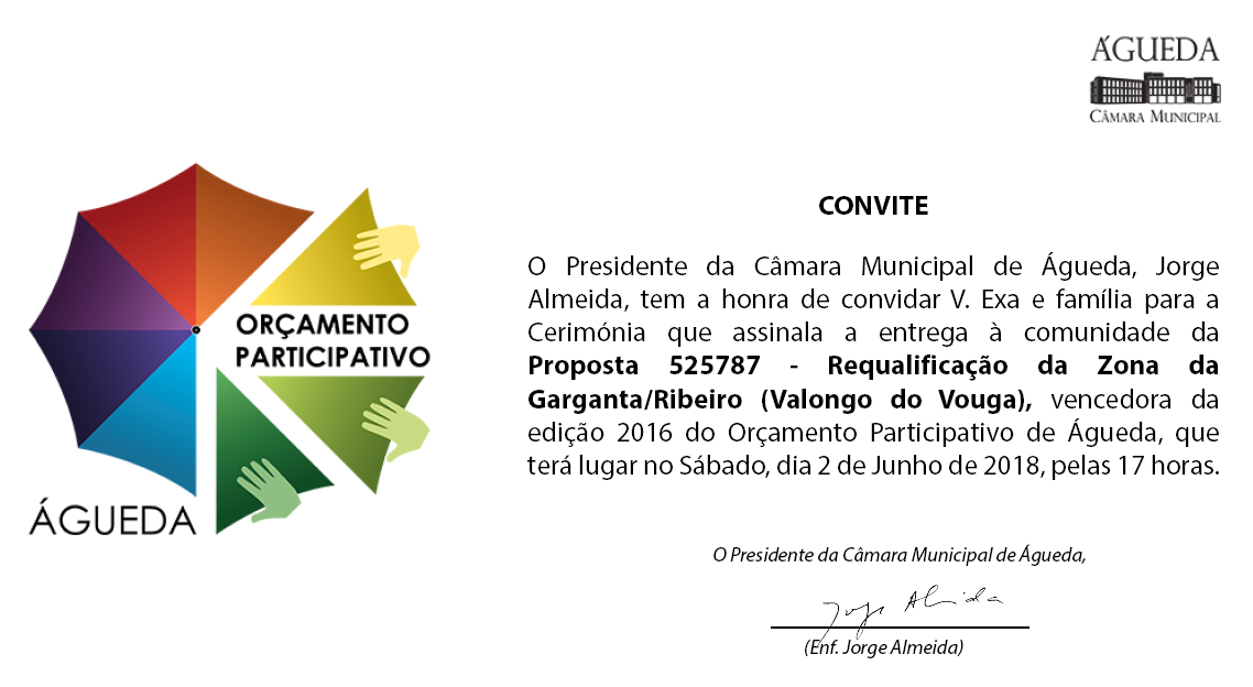 O Presidente da Câmara Municipal de Águeda e os proponentes convidam todos os interessados para a cerimónia que assinala a entrega do projeto à comunidade.