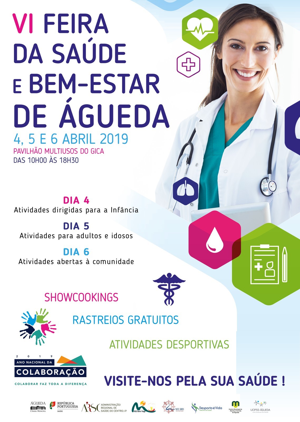 Durante três dias da feira todos os visitantes terão à sua disposição vários serviços e workshops, dos quais destacamos os rastreios gratuitos, nomeadamente índice de massa corporal, tensão arterial, visuais, auditivos, de colesterol, entre outros. Têm ainda a oportunidade de receber conselhos úteis para uma vida mais saudável, os cuidados a ter com a pele, reeducação postural ou higiene oral. Em simultâneo com os rastreios decorrem no recinto do GICA momentos de atividade física.