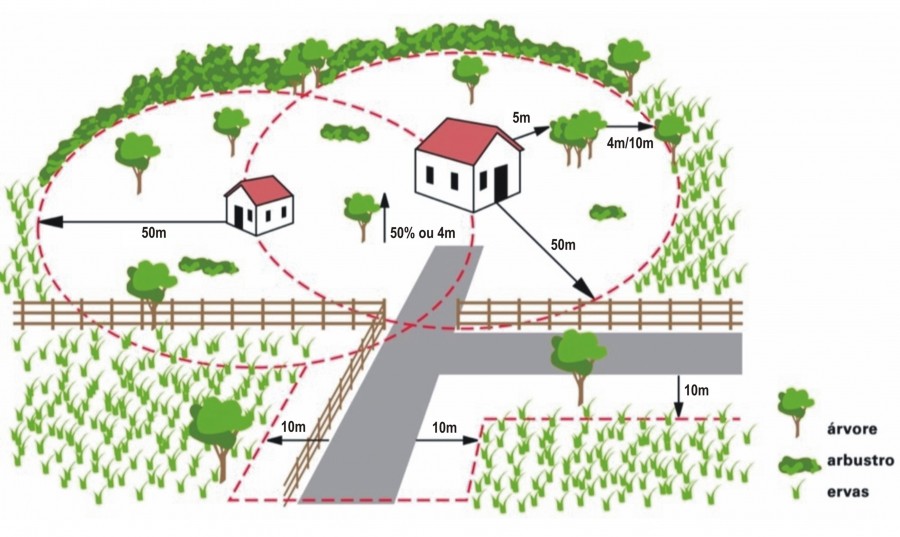 Os proprietários, arrendatários, usufrutuários ou entidades que, a qualquer título, detenham terrenos confinantes a edificações, designadamente habitações, estaleiros, armazéns, oficinas, fábricas ou outros equipamentos, inseridos em espaços rurais, são obrigados a proceder à gestão de combustível numa faixa de 50 m à volta daquelas edificações ou instalações medida a partir da alvenaria exterior da edificação.