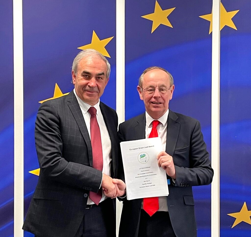 Jorge Almeida e Patrick Child, Diretor-Geral adjunto para o Ambiente da Comissão Europeia, rubricaram o contrato que formaliza o compromisso para fazer de 2026 “um ano de sucesso”, através da realização de um conjunto alargado de atividades com vista a continuar a melhorar a sustentabilidade ambiental e a contribuir para que Águeda seja cada vez mais verde e sustentável.