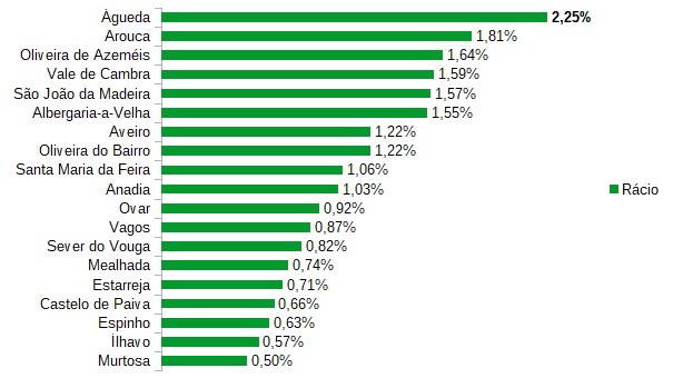 É possível ainda concluir que Águeda tem o maior rácio apurado entre o número total de empresas existente em cada concelho - segundo os dados da Por Data (2018) – e a quantidade de empresas que os mesmos concelhos têm na referida listagem.