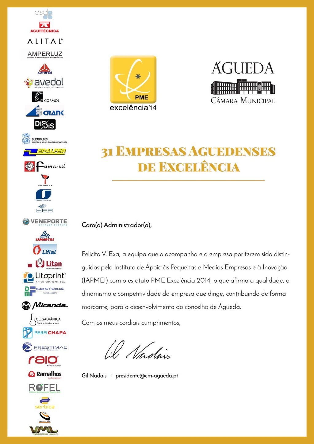 Leia na íntegra a carta aberta enviada pelo Presidente da Câmara Municipal de Águeda aos administradores das empresas PME EXCELÊNCIA 2014
