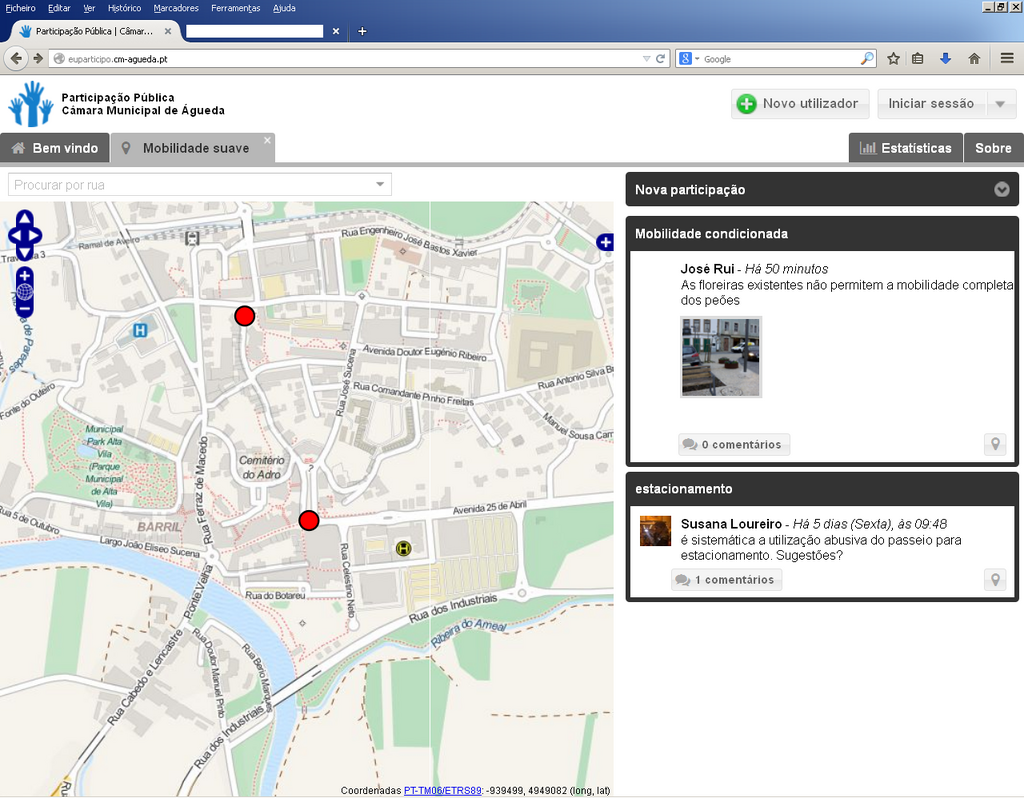 A plataforma “Eu Participo” http://euparticipo.cm-agueda.pt tem como suporte a componente territorial, o que permite georreferenciar as opiniões e factos, podendo a participação ser complementada por uma fotografia, que fica anexa a cada participação.