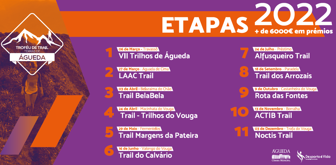 Esta competição, cujo regulamento pode ser consultado em www.cm-agueda.pt/pages/1648, leva mais de 4.000 atletas a 10 freguesias, percorrendo os trilhos em trail curto (15 a 17 quilómetros), trail longo (20 a 30 quilómetros) ou caminhada (8 a 10 quilómetros) e promovendo, desta forma, o território de Águeda e a sua potencialidade para este tipo de modalidades.