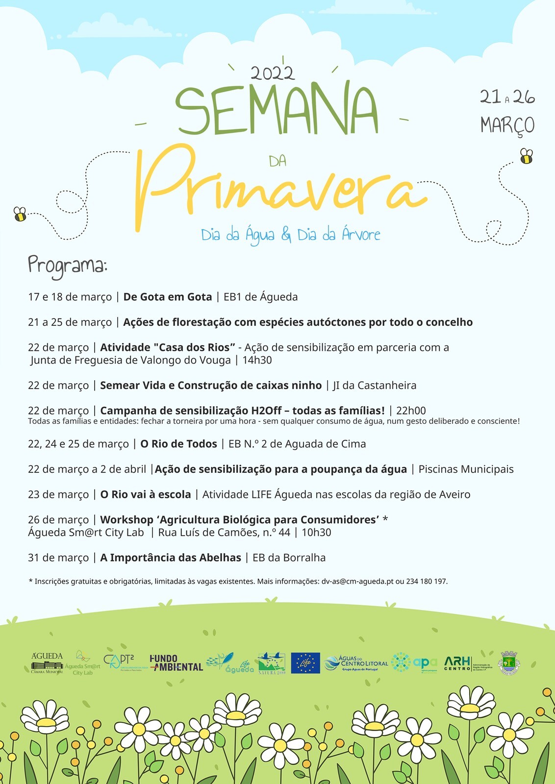 As atividades relativas à Semana da Primavera tiveram início nos dias 17 e 18 de março, com a dinamização de sete ações de sensibilização ambiental, intitulada “de Gota em Gota”, que decorreu no Jardim das Laranjeiras, junto ao Posto de Turismo de Águeda e onde estiveram envolvidas cerca de 170 crianças da EB1/JI de Águeda.