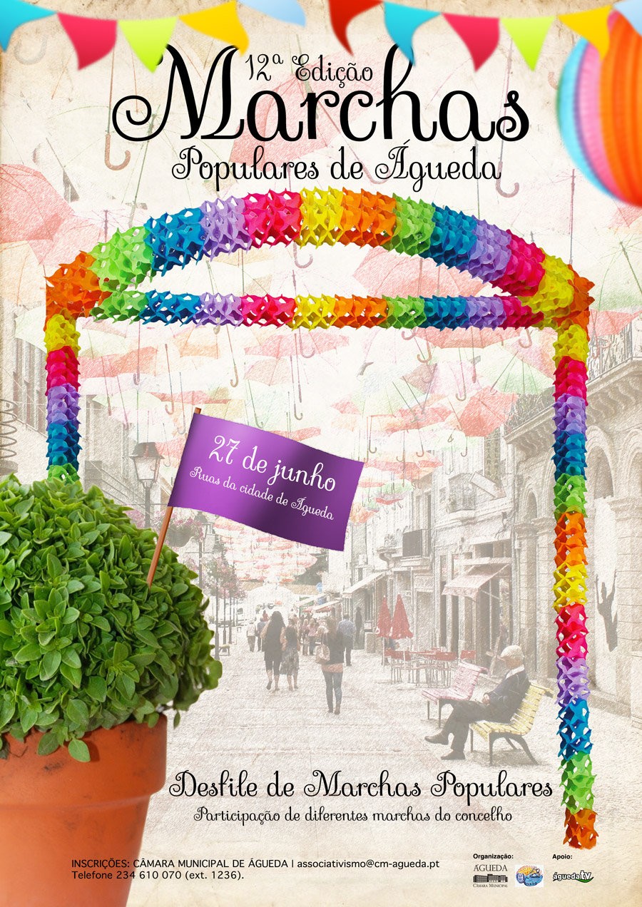área de conteúdos (não partilhada)No dia 27 de junho, sábado, a partir das 21 horas, as Marchas Populares saem à rua para colorir a Baixa da Cidade de Águeda. A Câmara Municipal, em conjunto com a Associação Sol Nascente, promove o tradicional desfile de Marchas Populares.