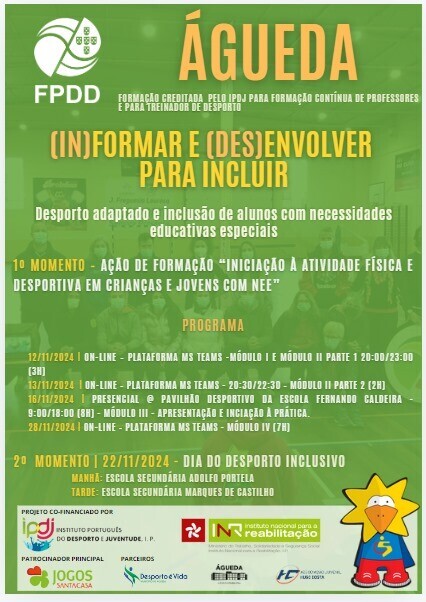 área de conteúdos (não partilhada)A FPDD realizará uma ação de formação do seu projeto (In)Formar e (Des)Envolver para Incluir, em Águeda, durante o mês de novembro, com sessões online nos dias 12, 13 e 28, e uma sessão presencial na Escola Fernando Caldeira no dia 16. Esta ação será subordinada ao tema: “Iniciação à Atividade Física e Desportiva em Crianças e Jovens com NEE”, com o programa disponível na seguinte ligação: https://fpdd.org/acoes-idi/