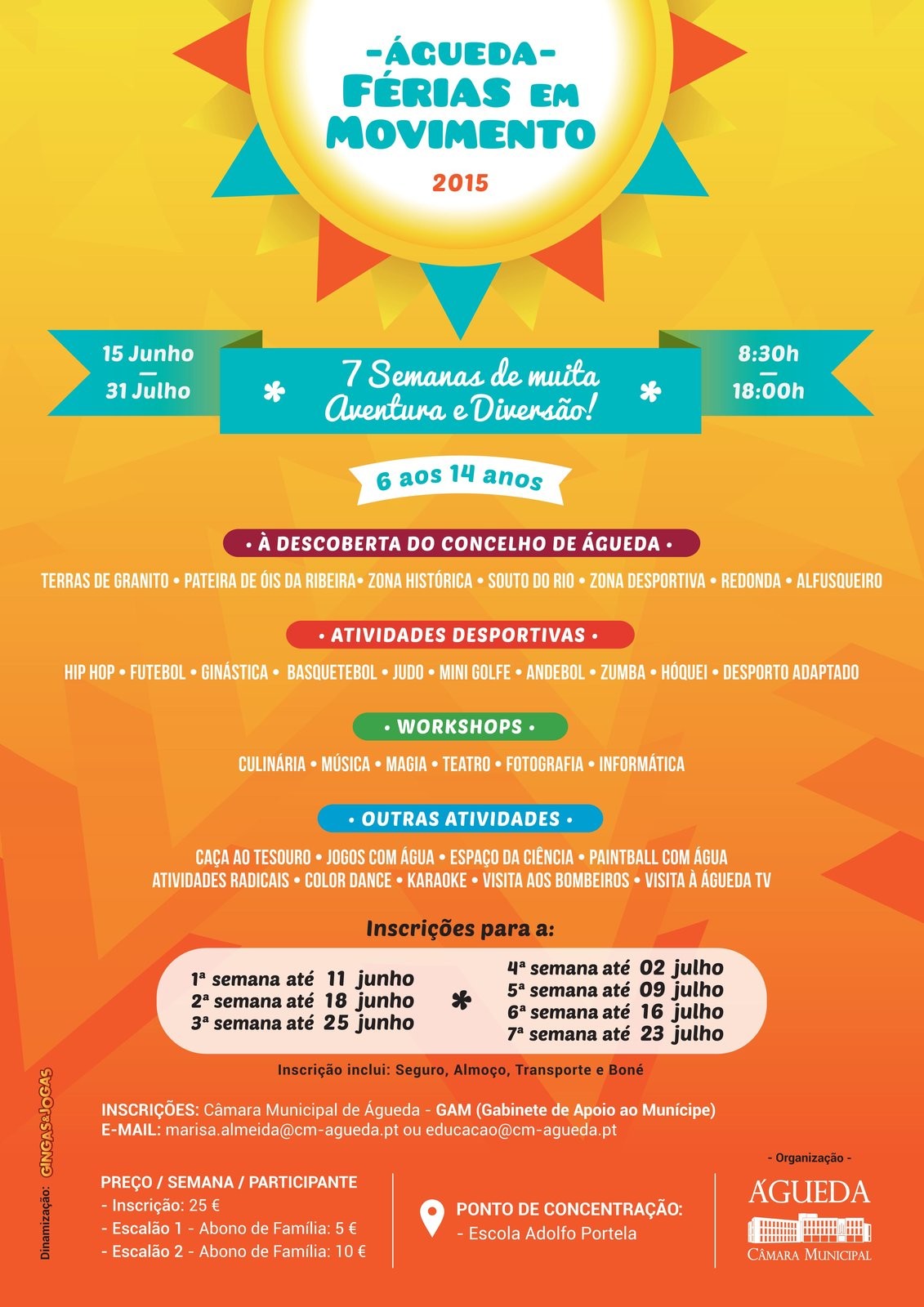 área de conteúdos (não partilhada)A Câmara Municipal de Águeda irá promover à semelhança dos anos anteriores, o projeto "Águeda - Férias em movimento 2015", um evento de sucesso, que visa ocupar as crianças e jovens através de atividades desportivas, de lazer e pedagógicas, onde estas poderão desfrutar de momentos únicos e dias inigualáveis de novas emoções e desafios.