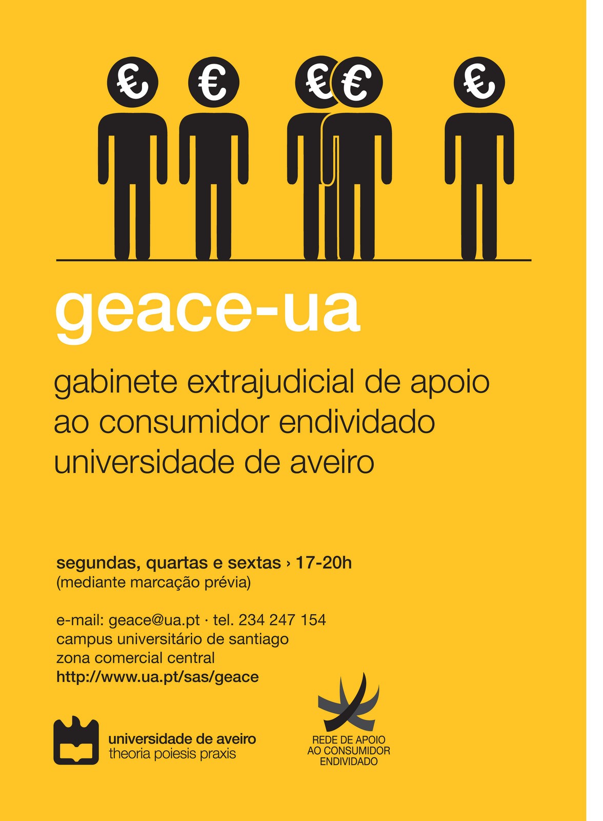 área de conteúdos (não partilhada)A Câmara Municipal em articulação com o Gabinete Extrajudicial de Apoio ao Consumidor Endividado da Universidade de Aveiro – GEACE-UA, promove, no dia 18-02-2016, pelas 18,00h, no Salão Nobre da Câmara Municipal, uma sessão aberta à população em geral e a dirigentes e técnicos de Instituições/ Associações, com vista à apresentação do trabalho que o gabinete desenvolve. A ação deste gabinete, concretiza-se através de ações de informação/aconselhamento do consumidor, de ajuda na gestão do orçamento familiar e de renegociação dos encargos /créditos bancários e destina-se a todos os consumidores que têm dificuldades no cumprimento de contratos de crédito, quer porque se encontram em risco de incumprimento; quer porque já têm prestações de crédito em atraso.