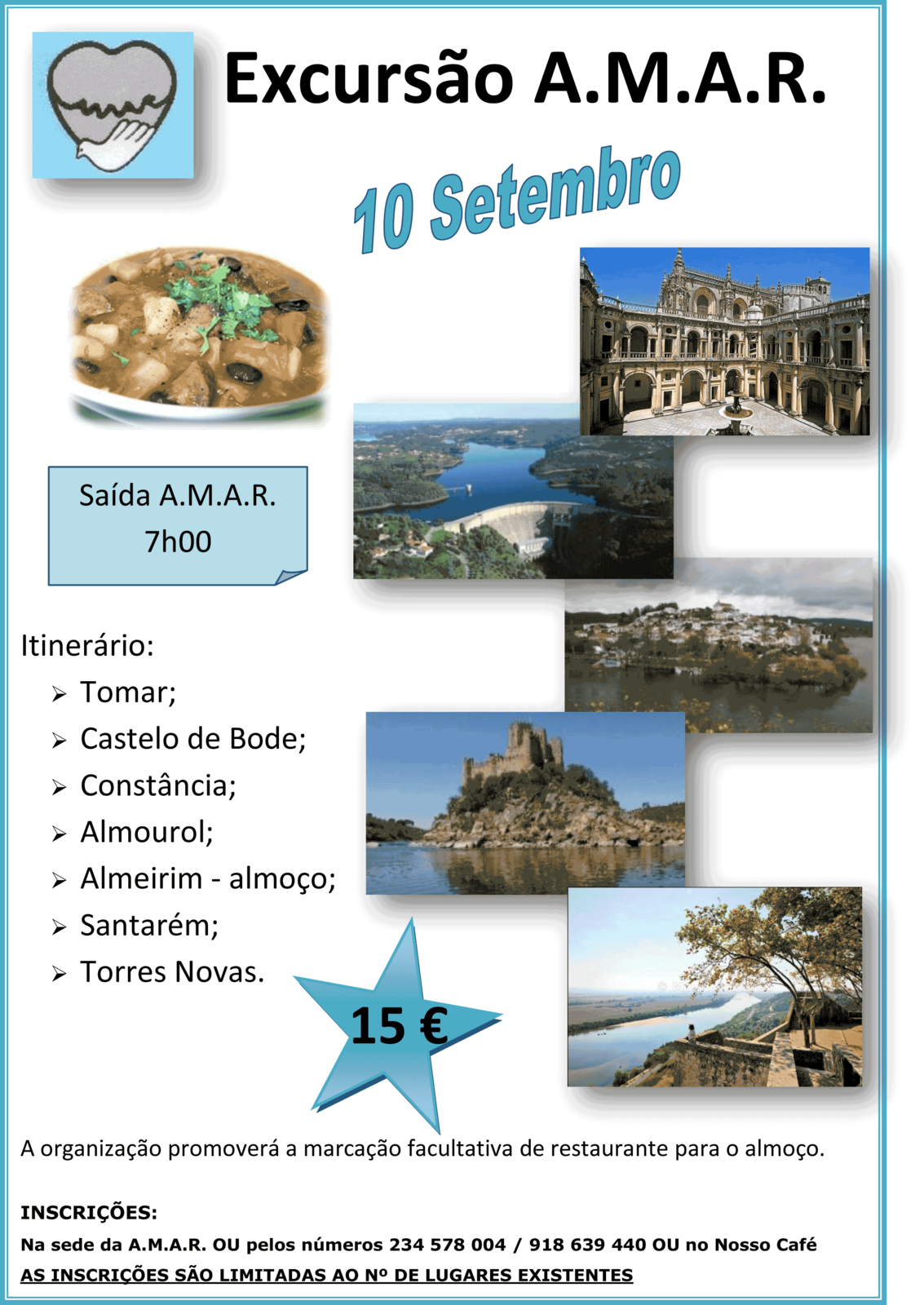 Com passagem por: Tomar (jardins e convento de cristo), castelo de Almourol, Constância, barragem de Castelo de Bode, Almeirim e Santarém (portas do sol)