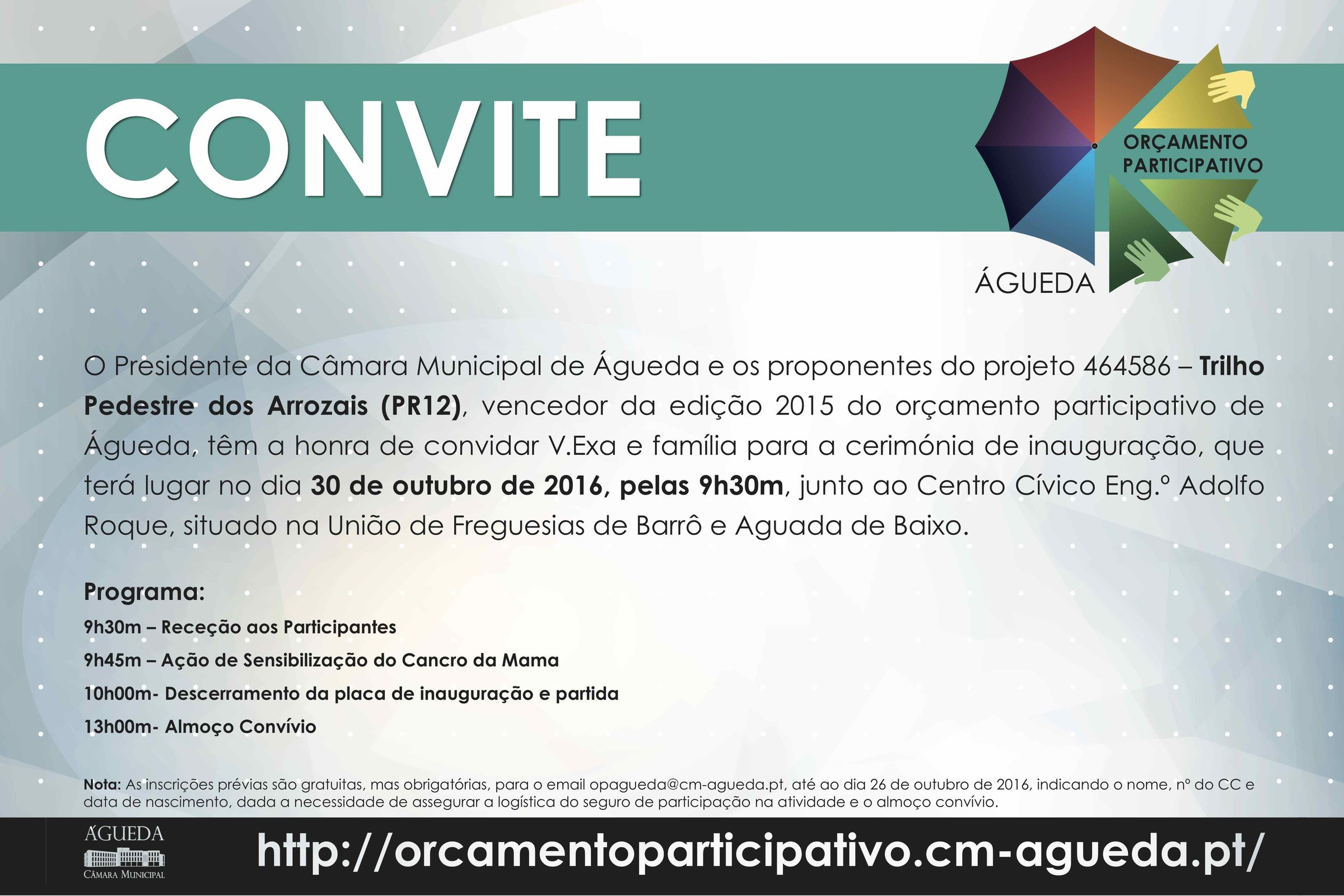 área de conteúdos (não partilhada)O Presidente da Câmara Municipal de Águeda e os proponentes do projeto 464586 – Trilho Pedestre dos Arrozais (PR12), vencedor da edição 2015 do orçamento participativo de Águeda, têm a honra de convidar V.Exa e família para a cerimónia de inauguração, que terá lugar no dia 30 de outubro de 2016, pelas 9h30m, junto ao Centro Cívico Eng.o Adolfo Roque, situado na União de Freguesias de Barrô e Aguada de Baixo.