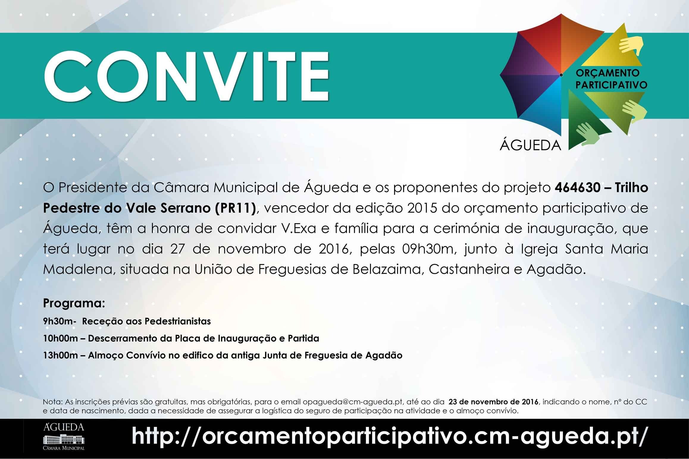área de conteúdos (não partilhada)O Presidente da Câmara Municipal de Águeda e os proponentes do projeto 464630 – Trilho Pedestre do Vale Serrano (PR11), vencedor da edição 2015 do orçamento participativo de Águeda, têm a honra de convidar V.Exa e família para a cerimónia de inauguração, que terá lugar no dia 27 de novembro de 2016, pelas 09h30m, junto à Igreja Santa Maria Madalena, situada na União de Freguesias de Belazaima, Castanheira e Agadão.