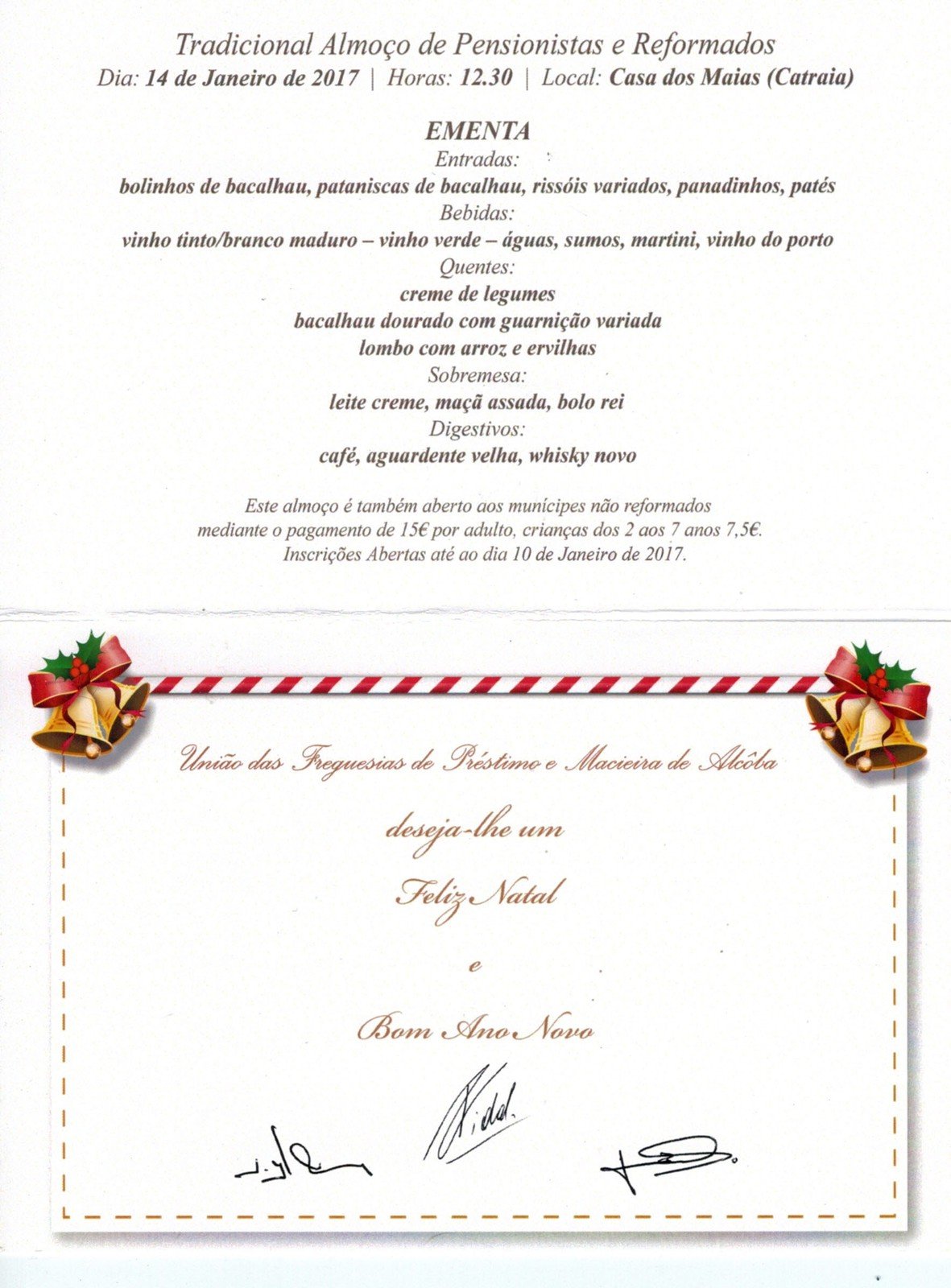área de conteúdos (não partilhada)No dia 14 de janeiro, sábado, vai realizar-se o tradicional almoço de Reis promovido pela Junta de Freguesia. O evento começa às 12h30 na Casa dos Maias, na Catraia de Assequins.