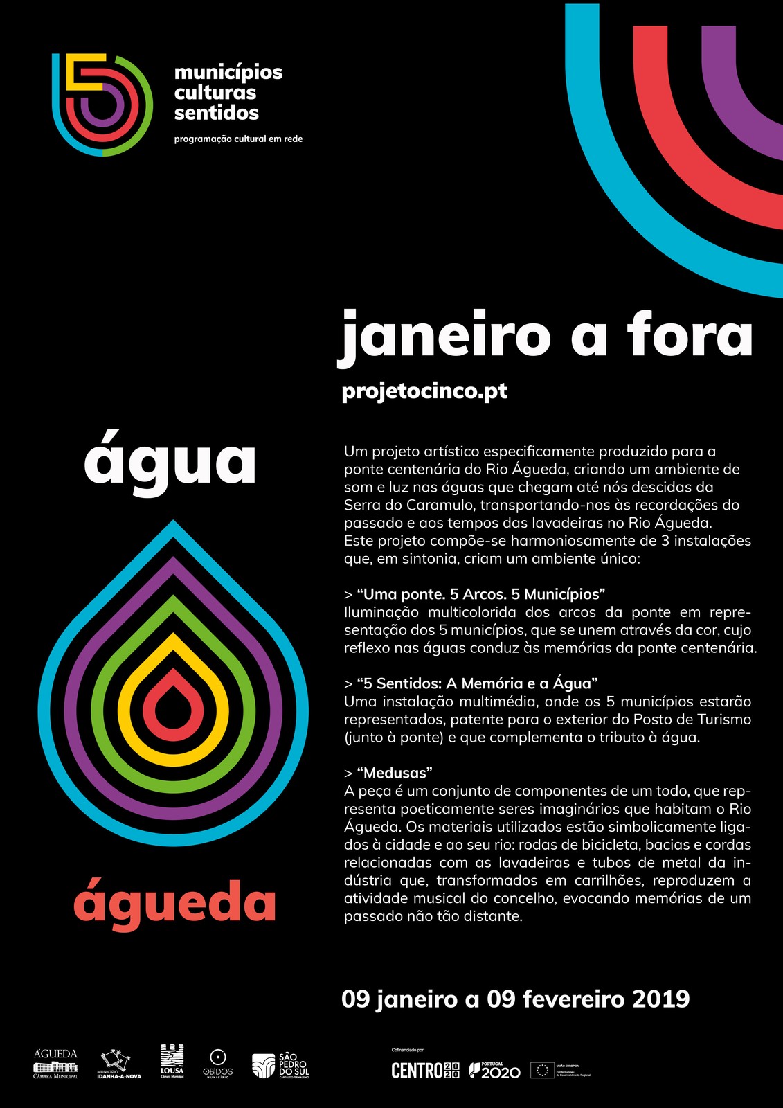 área de conteúdos (não partilhada)Ao abrigo da Programação Cultural em Rede do projeto “5 Municípios, 5 Culturas, 5 Sentidos” coordenado pelo Município de Idanha-a-Nova e realizado em co-promoção com os Municípios de Águeda, Óbidos, S. Pedro do Sul e Lousã, inicia agora em janeiro um projeto artístico especificamente produzido para a ponte centenária do Rio Águeda.