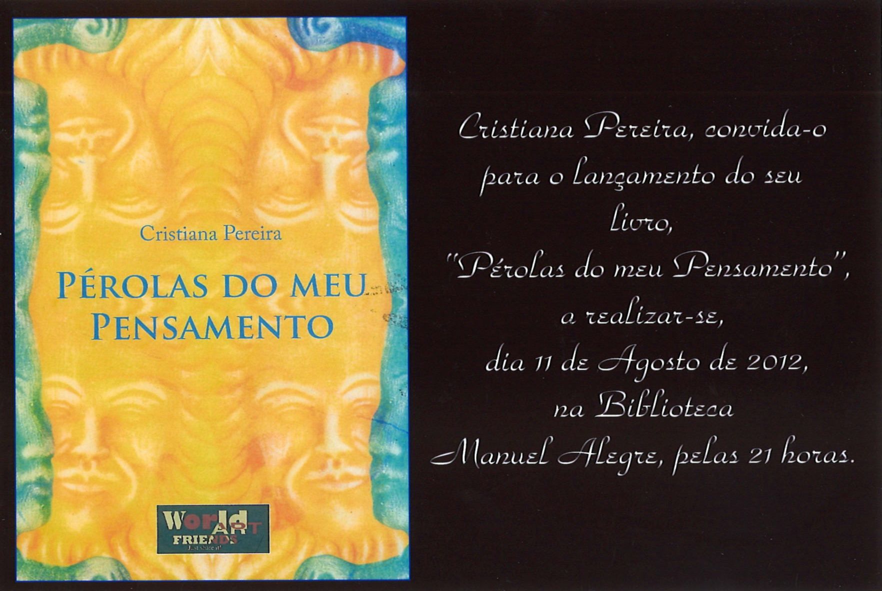 Adicionar a calendário2012-08-11 21:00:002012-08-11 21:00:00Europe/LisbonLançamento do livro “Pérolas do Meu Pensamento”, de Cristiana Pereira Biblioteca Municipal Manuel Alegre, Águeda