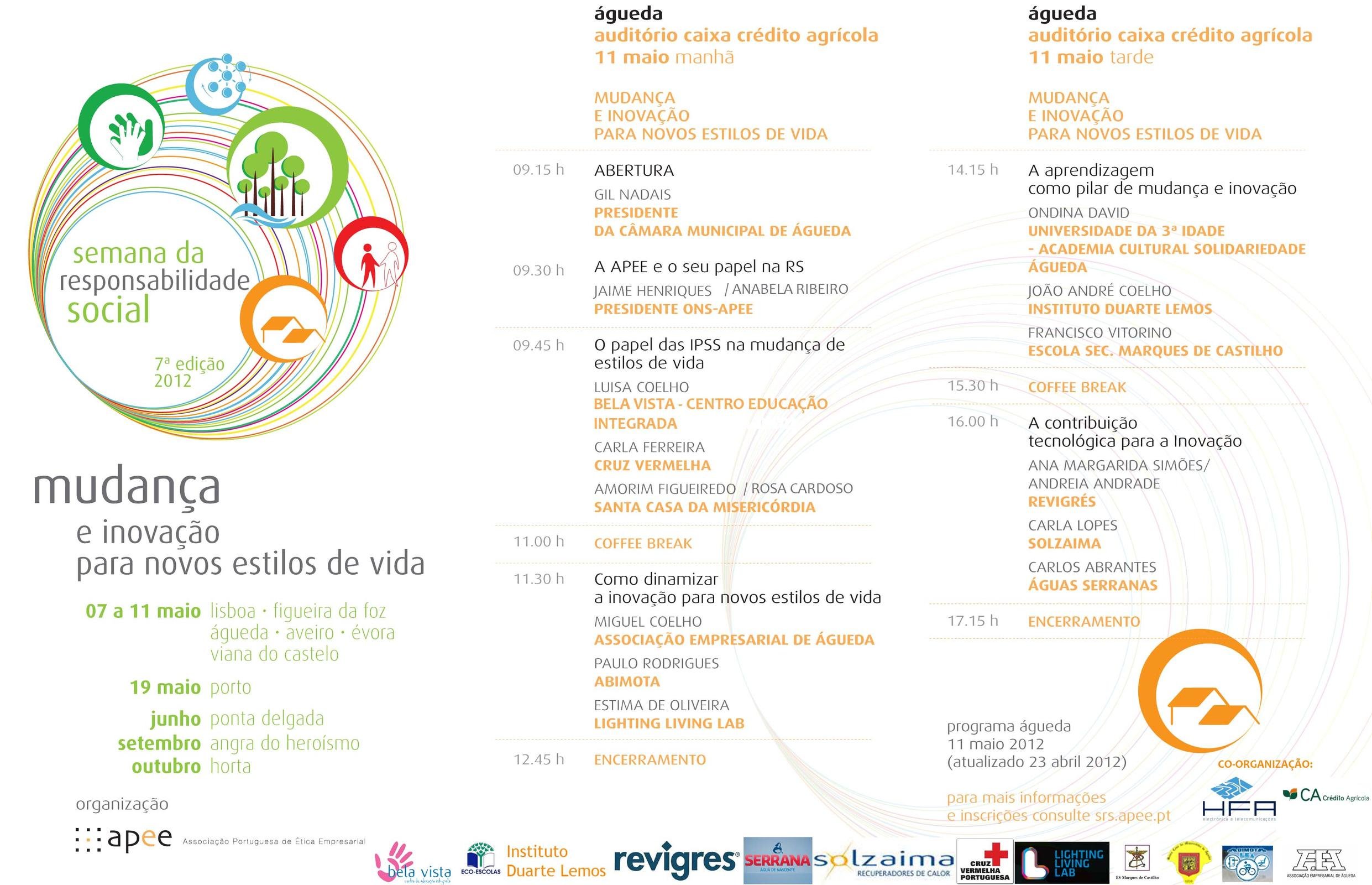 área de conteúdos (não partilhada)A APEE e a HFA vão promover um Seminário, inserido na 7ª edição da Semana da Responsabilidade Social – mudança e inovação para estilos de vida (SRS), que reunirá empresas e entidades da região de Águeda para debater o tema da 7.ª edição do SRS. As atividades irão decorrer no anfiteatro da Caixa de Crédito Agrícola de Águeda, conforme o programa em anexo.