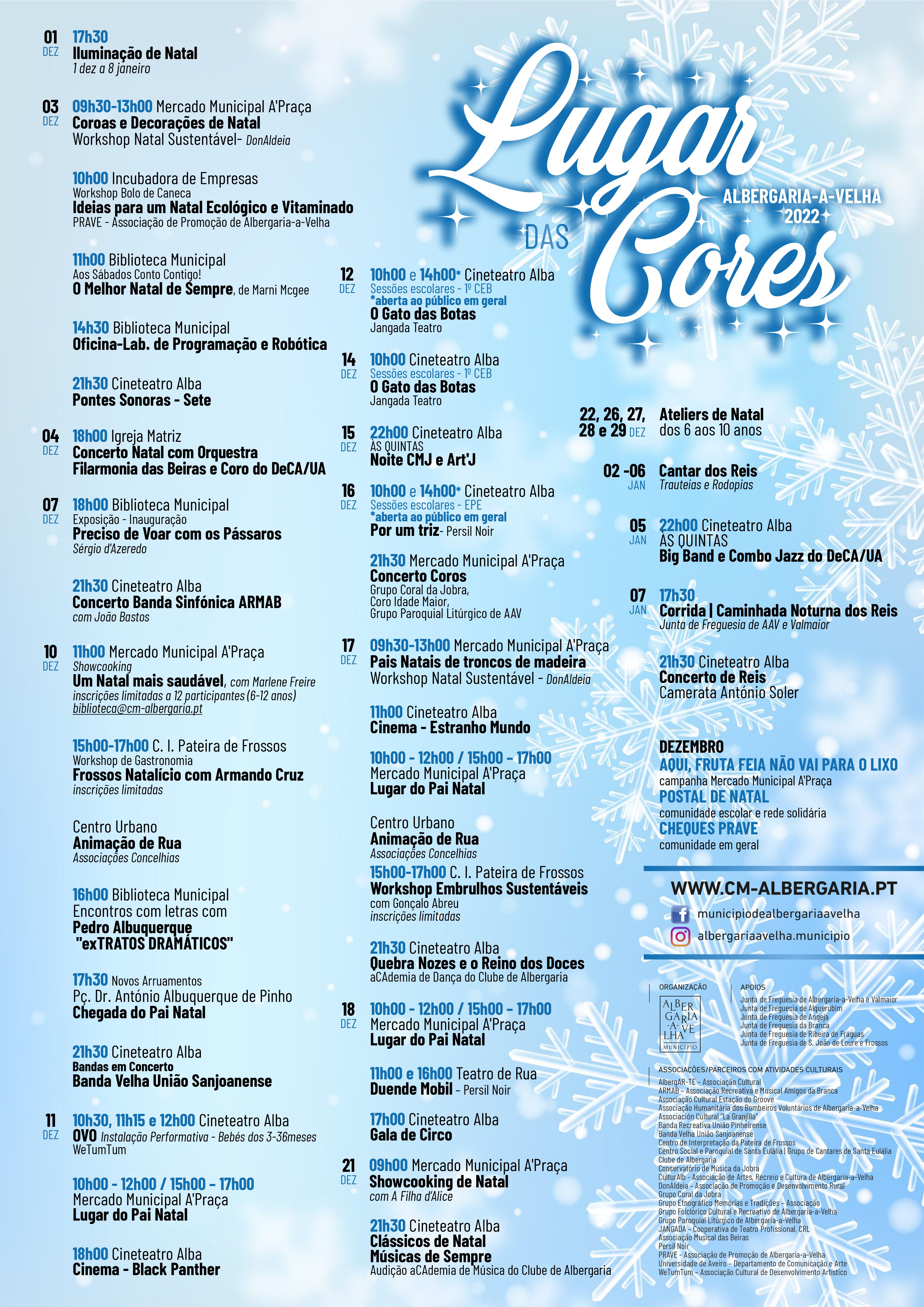 Antes do ano de 2022 acabar, há ainda tempo para o concerto “Clássicos de Natal – Músicas de Sempre” no Cineteatro Alba (21 de dezembro, 21h30) e os tradicionais Ateliers de Natal para ocupar as crianças e os jovens durante a pausa letiva.